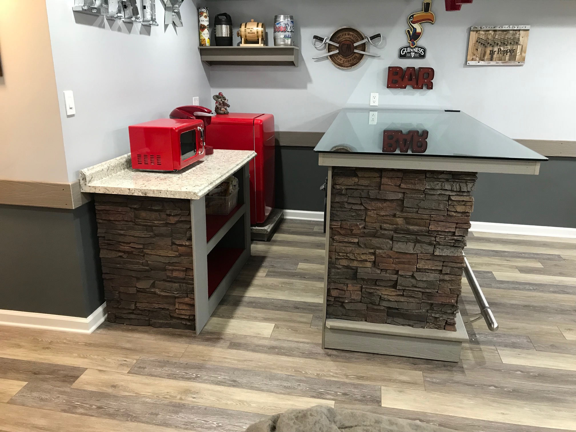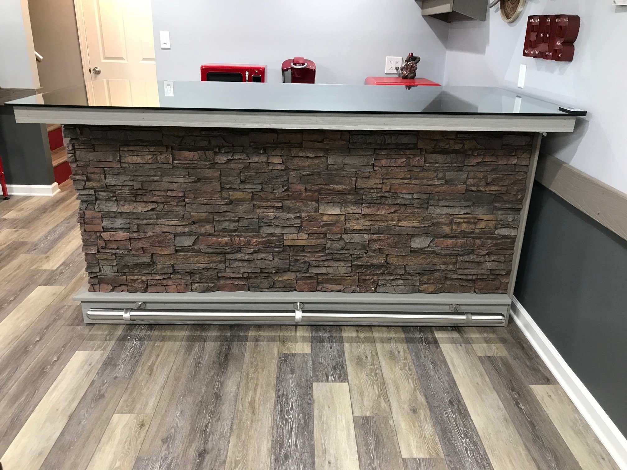 Ricky has been working on a finished basement project, and he purchased our stacked stone column wraps to conceal the support beams in the basement. But he had something more in mind. In his email to us he wrote: "I wanted a matching look between the columns and the bar, so I ordered your Norwich Colorado Stacked Stone panels in Earth."