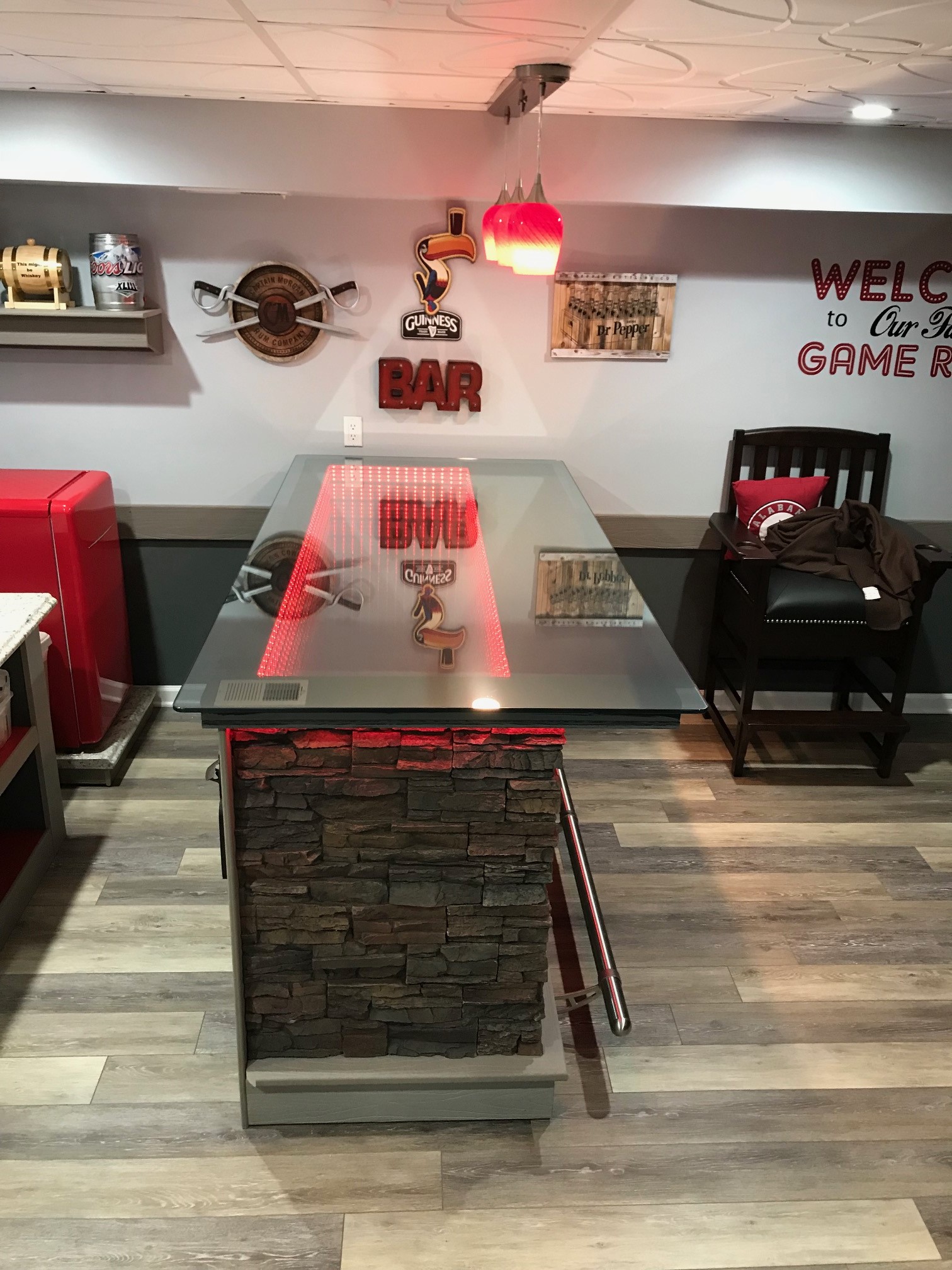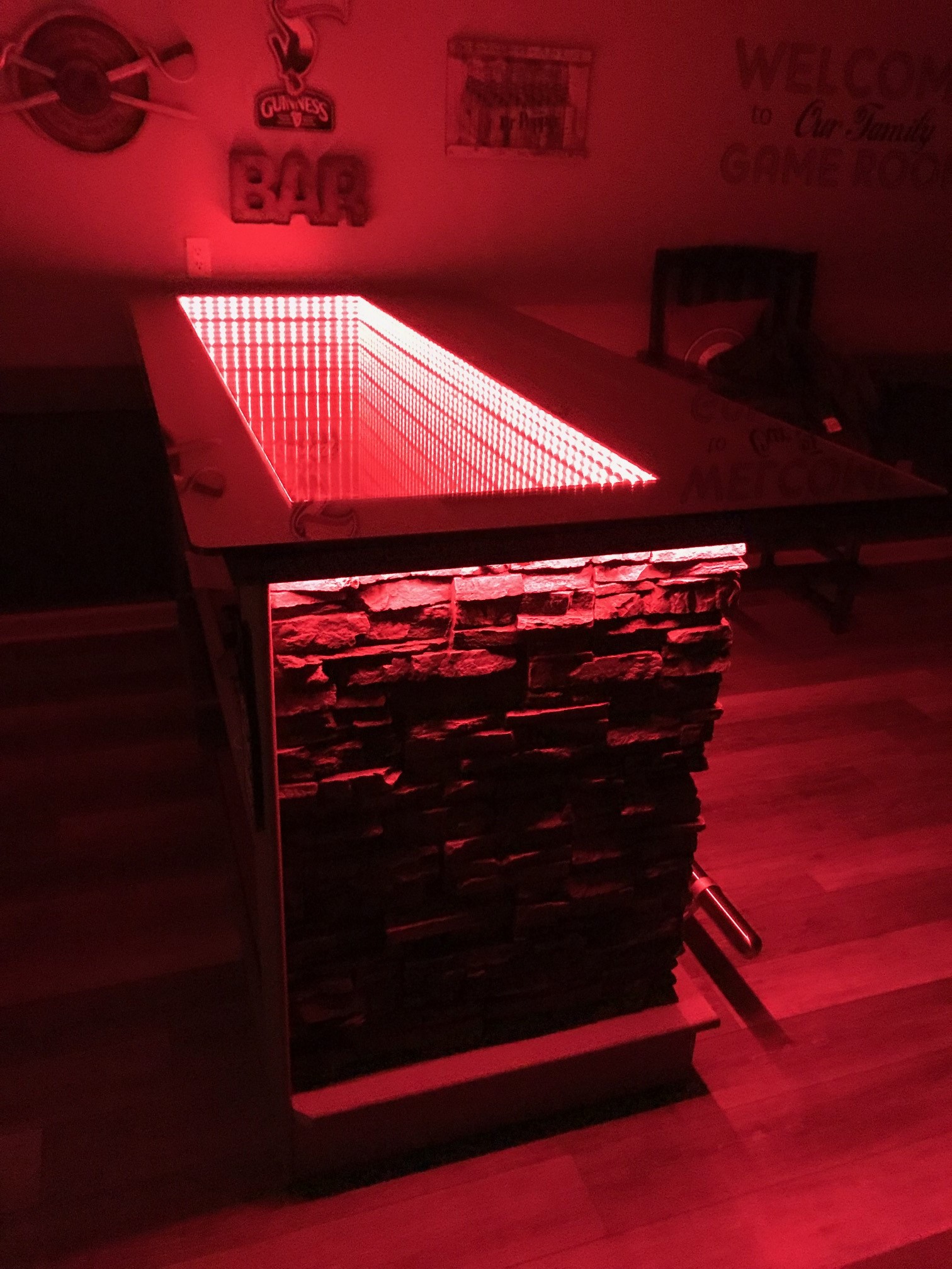 Return customer and expert DIY'er Ricky sent us these photos of his newly-built home bar, made incredible with an infinity mirror top and Norwich Stacked Stone panels.