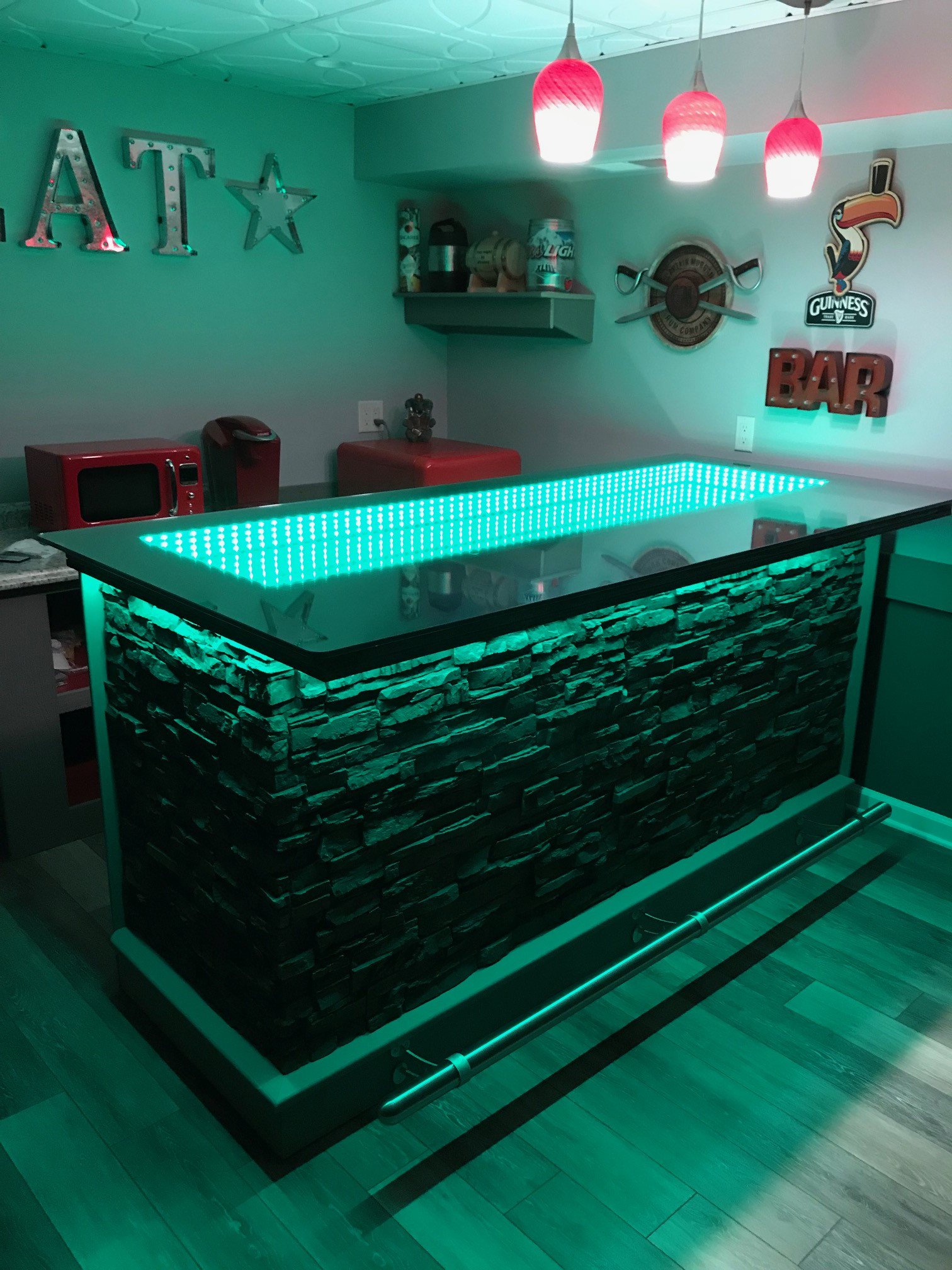 In the light of day, Ricky's project seems fairly standard. He cut the panels to fit using regular carpentry tools, and then installed the veneer directly to the flat surface of his bar and cabinet using construction adhesive. However, when the lights go off you can see Ricky's design expertise at work; because his bar is anything but ordinary.