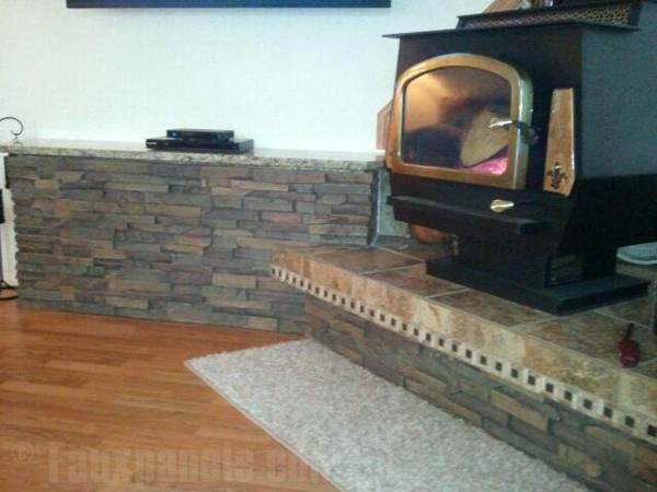Fortunately, we were able to offer a cost-effective alternative that didn't compromise on looks. Using Wellington Drystack panels in earth shades, the enterprising homeowner built a gorgeous stove platform, beginning with a simple wood frame.