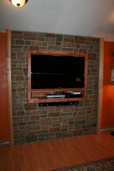 Shana knocked through the brick wall to reveal the empty fireplace space behind, and used that to build a wall niche perfectly sized to accommodate a flat screen TV and cable box. She then framed that with just a few of the Ledgestone panels – cut perfectly to size with a regular wood saw and mounted in minutes with wood screws and a power drill.