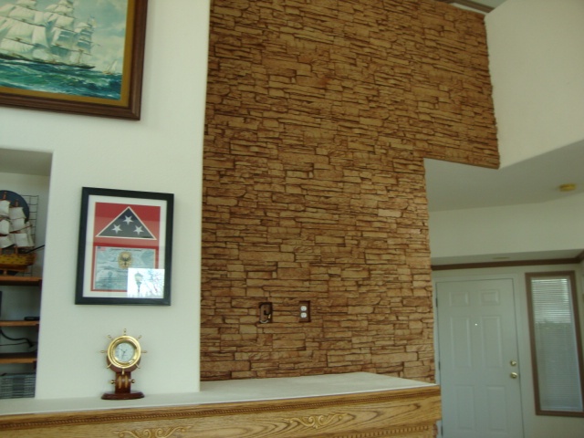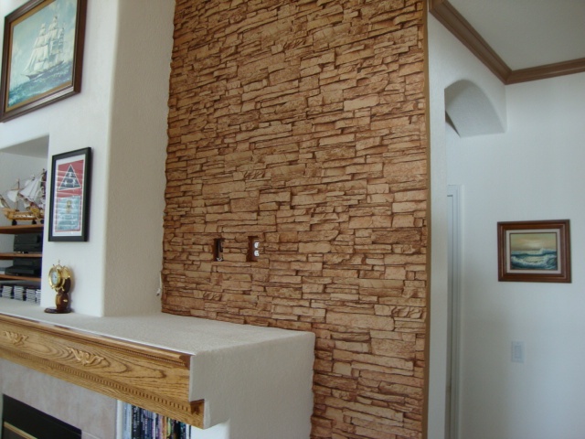 In Dan's case, he had a towering wall to cover; and had to cut his panels to shape, and also to allow for electrical outlets. The fact that the wall space he was covering was so tall also meant he had to 'stagger' each subsequent row - cutting the row of panels above the first one in half, so that the realistic stone texture wasn't too obviously duplicated.