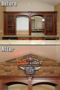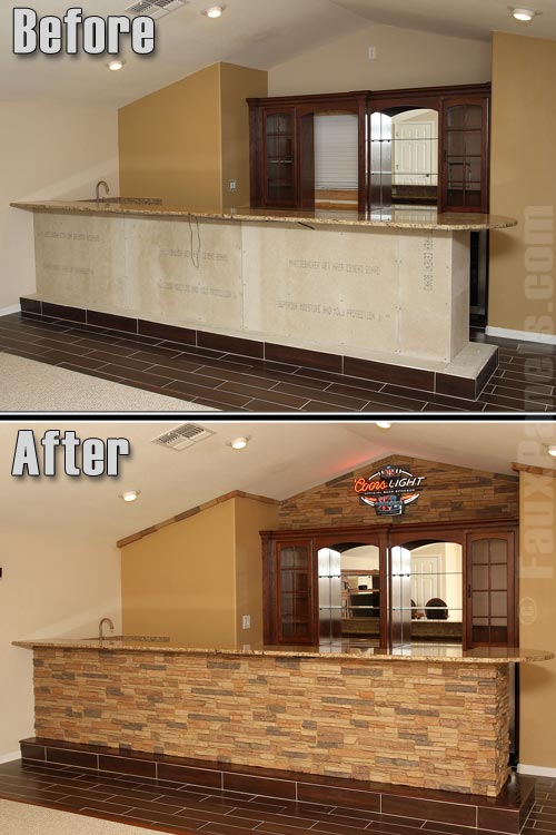 Before and after photo of home bar finished with the look of real stacked stone. Before and After - a pub that sets the bar high!