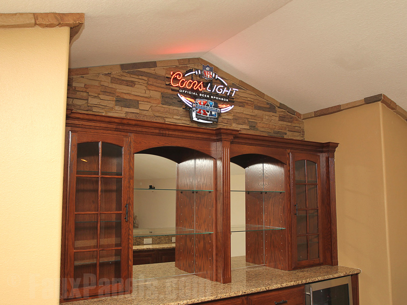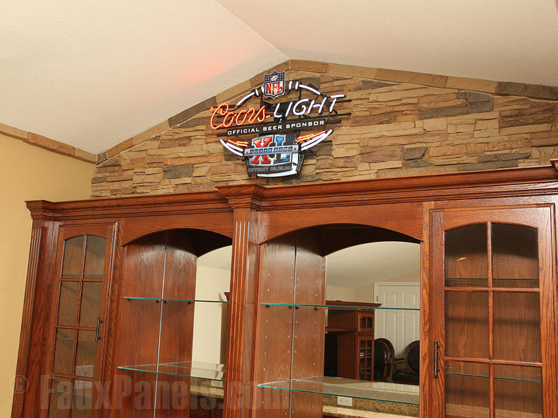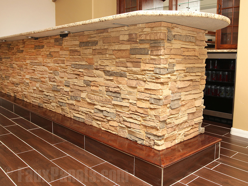 Up close view of home bar covered in Stacked Stone panels The bar itself was finished with stone panels, to give a timeless, rustic appearance.