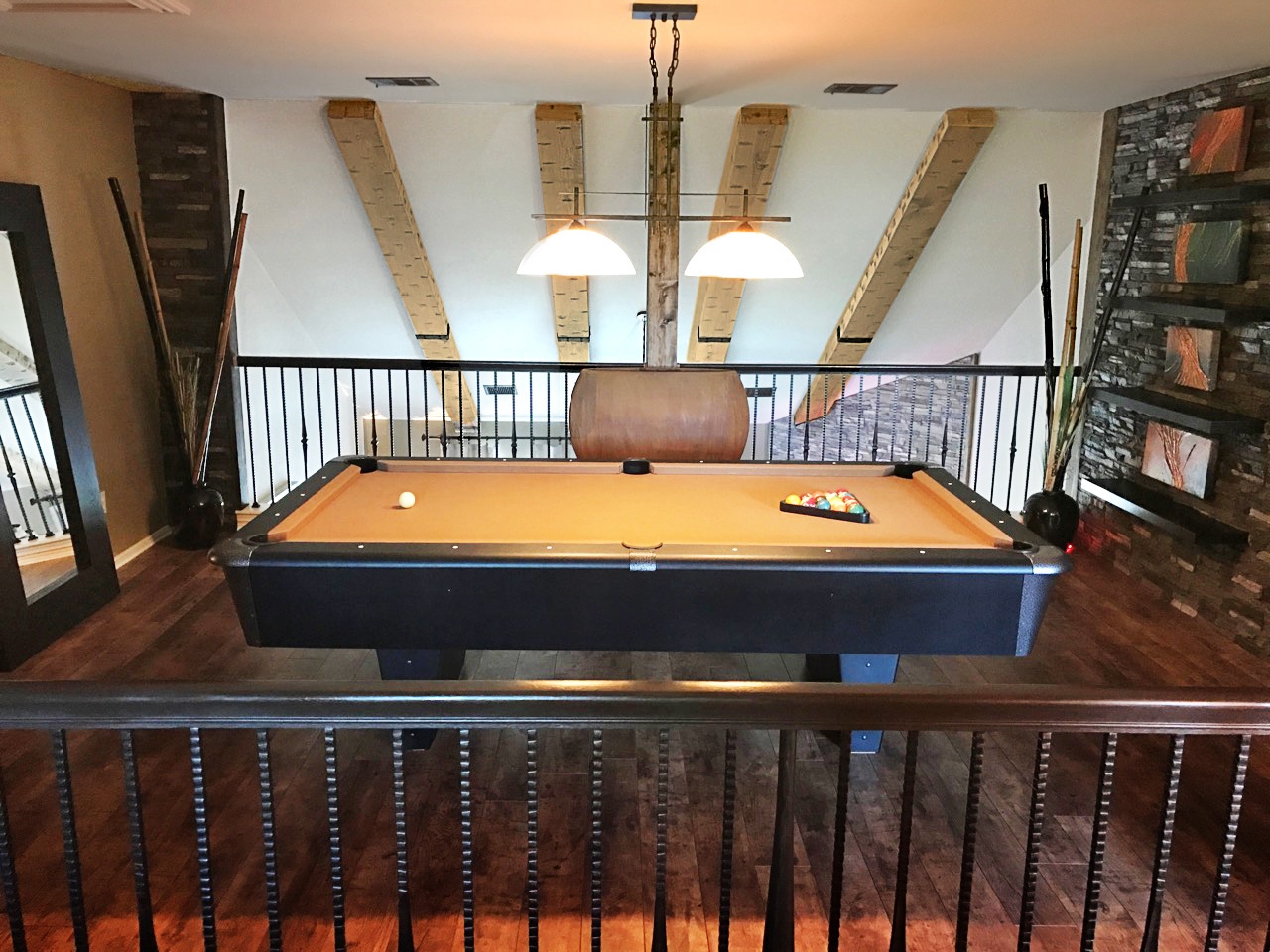When we first received pictures of this project we were obviously impressed, in particular how the beautiful new decor matched the unique layout of the house. In this instance, the mezzanine overlooking the ground floor was redesigned into a game room, complete with a full-sized pool table and bar.