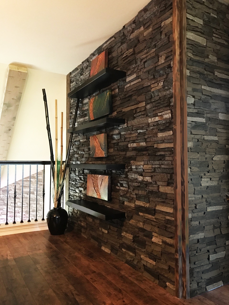 Norwich Colorado Stacked Stone panels in Iced Coffee color were used to create accent walls around the room, beautifully installed from floor to ceiling and vividly resembling real stone. The contrast with the hardwood floors is particularly vivid - and for a product that has earned its reputation on realism, it's truly impressive just how real these panels look.