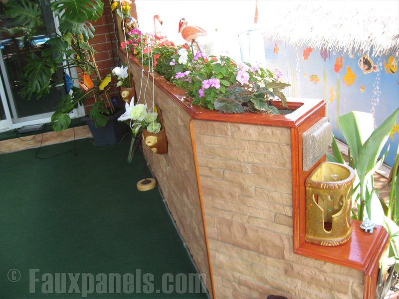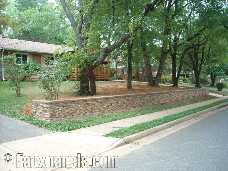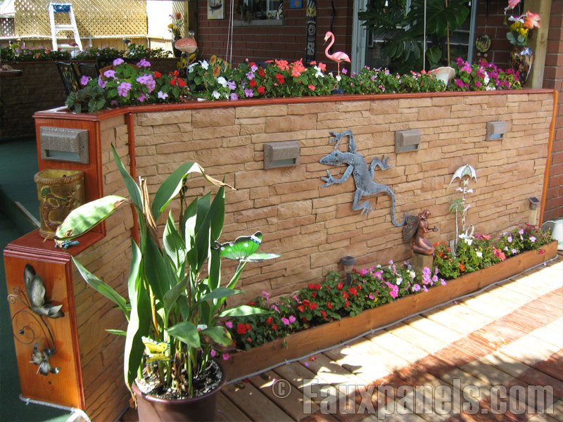 Joe K. of Fergus Ontario, Canada built a box planter / divider wall extending out from his house in just one afternoon with the help of Nailon Stone Wall siding in Desert Sunset.