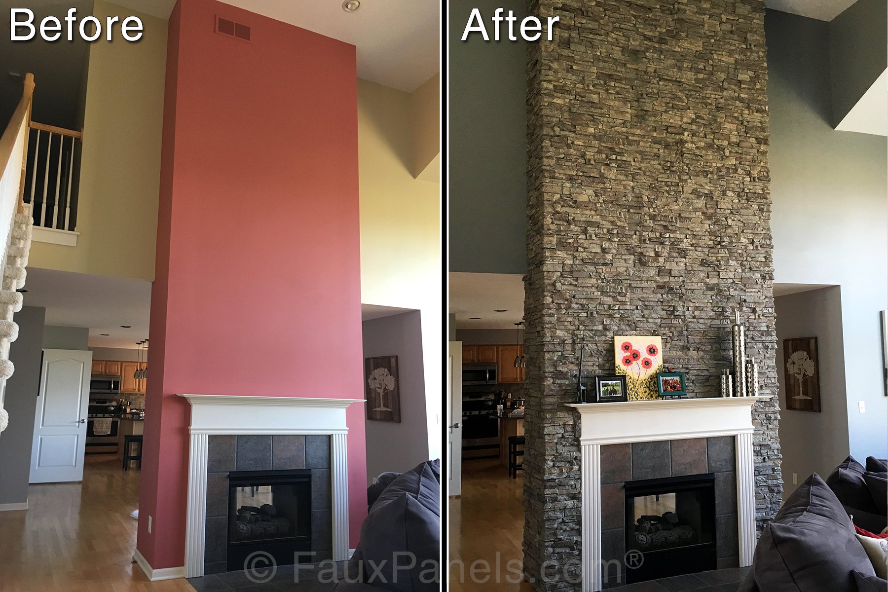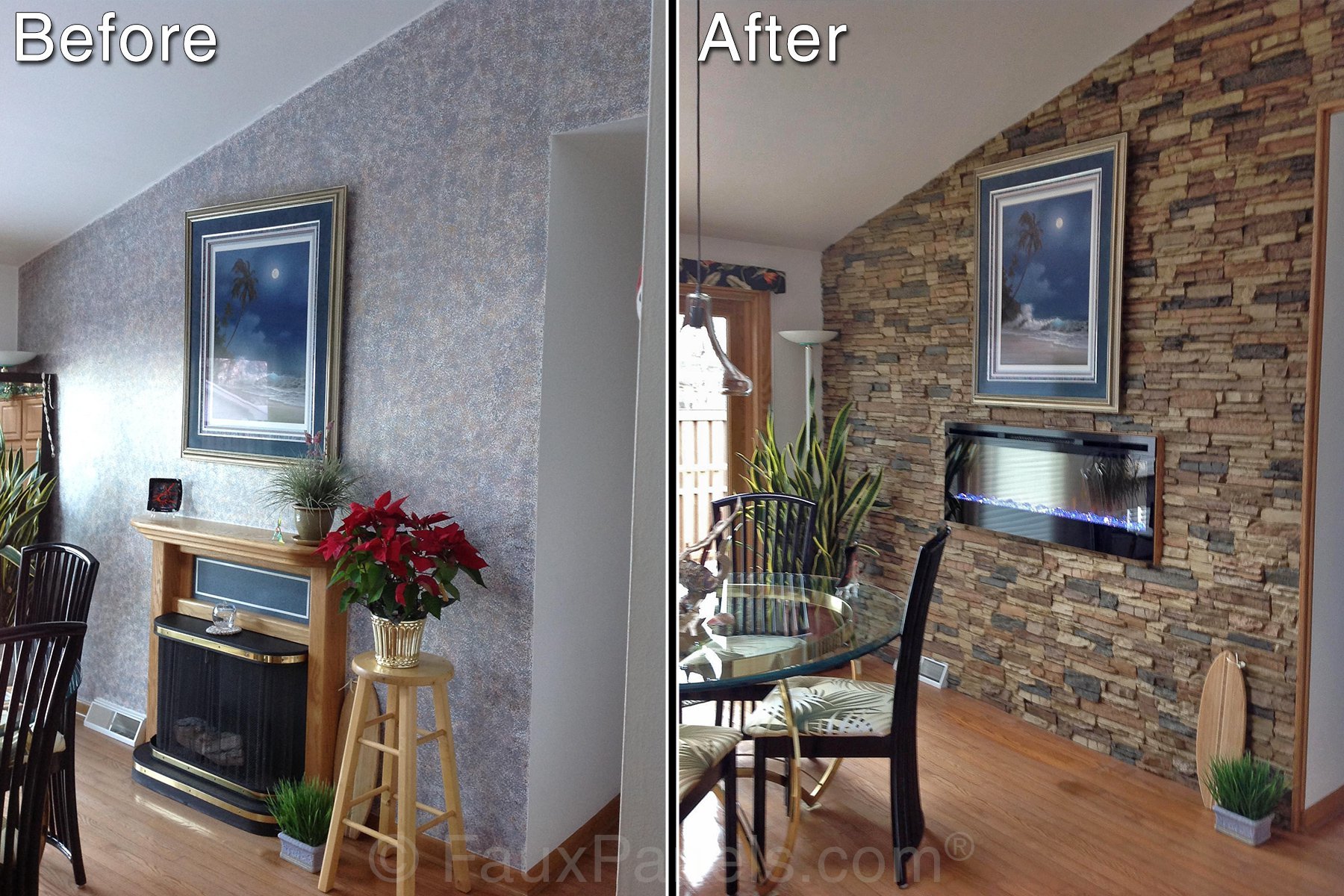 This is why one of the most popular uses for our panels is for resurfacing fireplaces and chimneys. Every week we get sent new photos from enterprising homeowners who've covered up their boring drywall or tile with the look of real stacked stone, ledgestone, brick and more.
