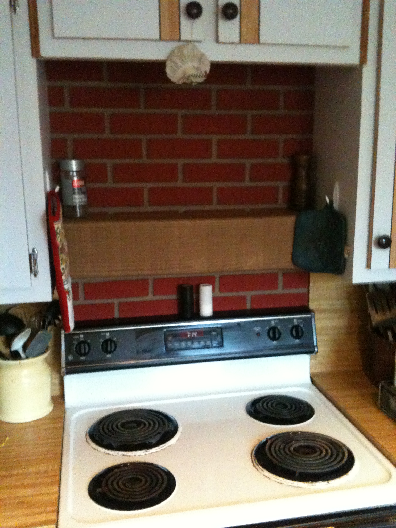 "The area behind my Stove was very “Blah”!" George explained, with pictures of "before" and "after" he and Jay got busy with the leftover materials. "After doing some theatre scenery, my brother-in-law had some leftover sections of brick panel and a beam we had given him, so my son Jay and I came up with an idea on how to brighten up the area by using the brick to create a backsplash, and using the beam piece as a shelf."