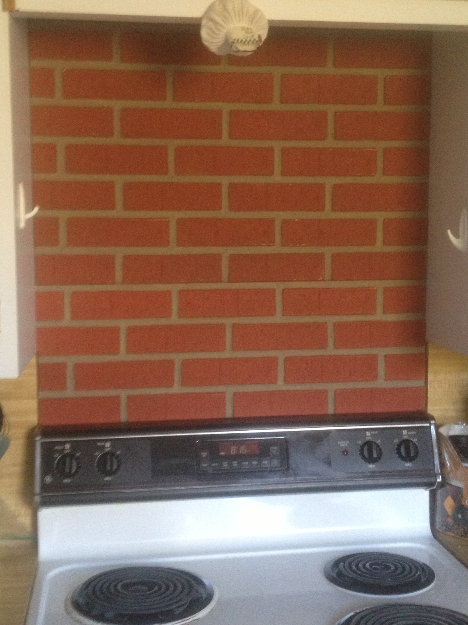 Cool kitchen backsplash created with brick panels left over from another design project. AFTER: The finished product; combining our brick panels with a length of faux wood beam.