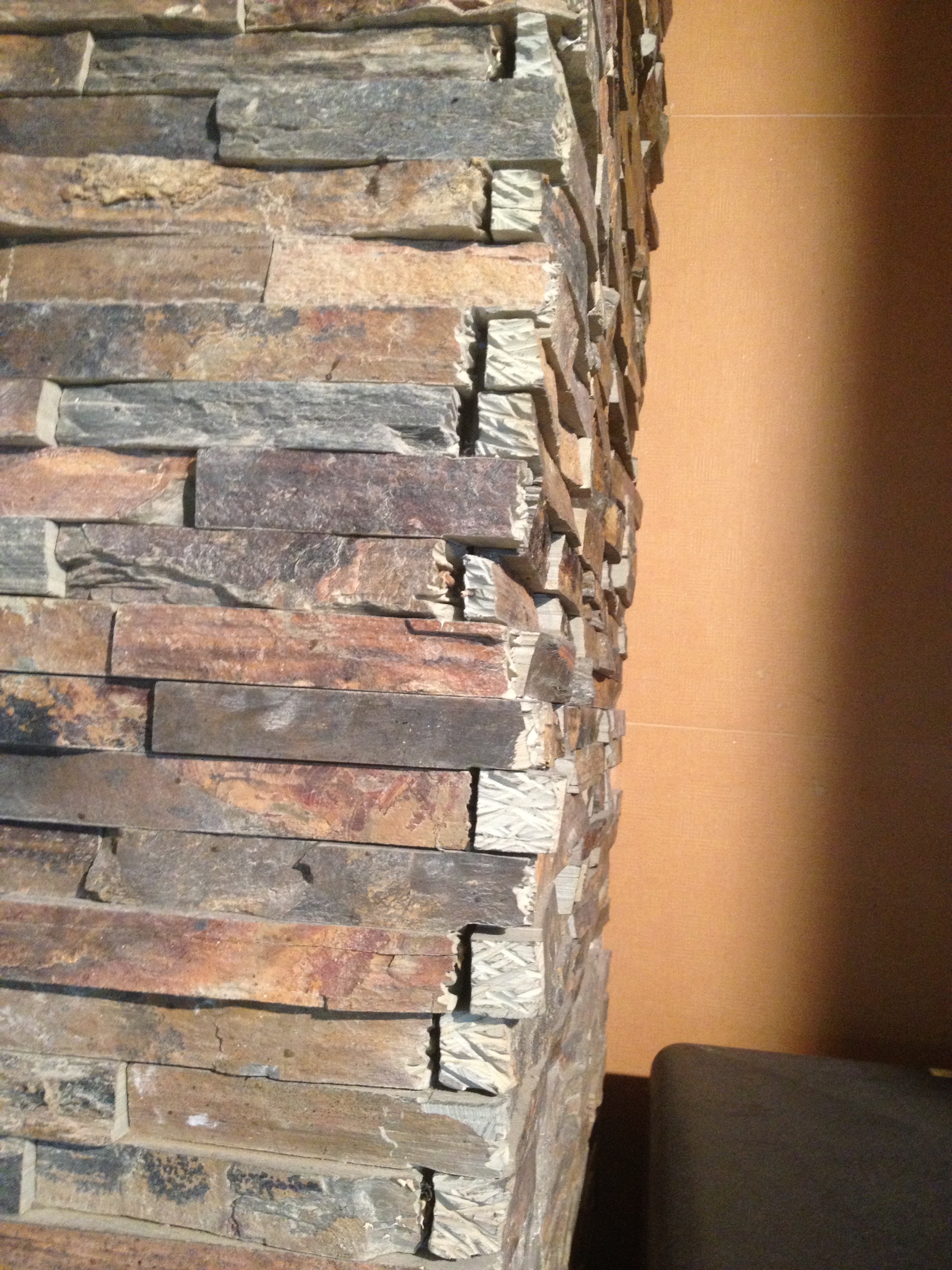 By attempting to mimic the look of stone wall with thin slivers of stone or cultured stone tiles instead, they need to be carefully jigsawed and attached - and that creates inherent points of weakness, especially at the corners.