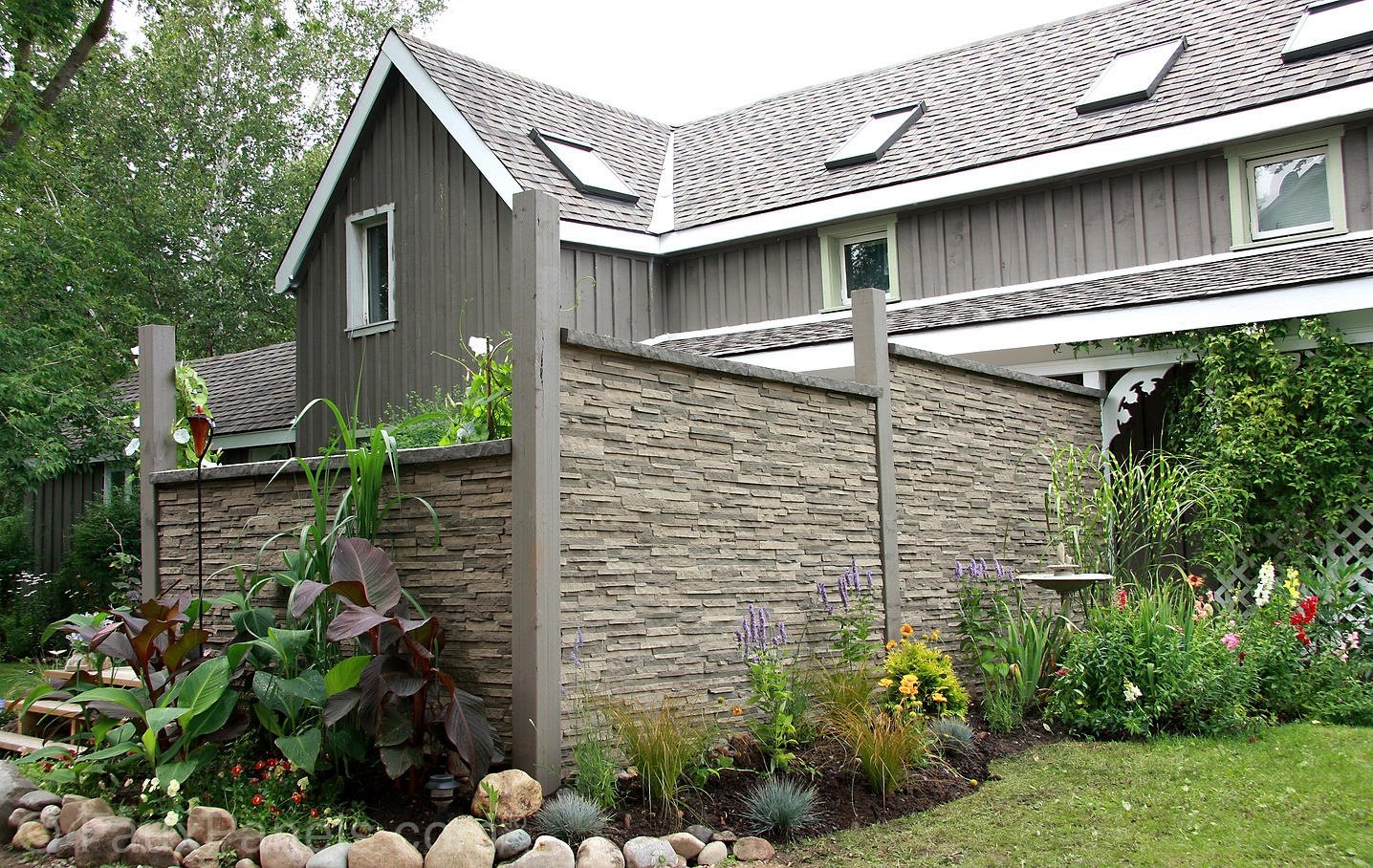 Privacy fence built with wooden framing and fake stacked stone panels in Kentucky Gray. This privacy fence created with Stacked Stone panels was erected in just a few hours.