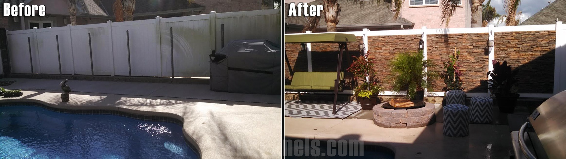 Before and after photo: poolside privacy fence remodeled with stacked stone panels. This poolside privacy wall got a beautiful update with Regency Stacked Stone panels in Ponderosa color
