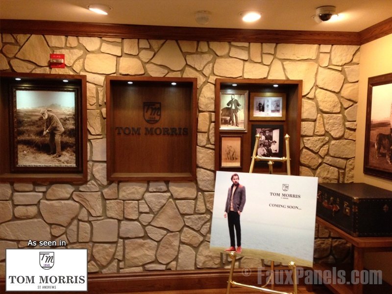 In the image below, Carlton Fieldstone panels in Limestone add an outdoorsy feel to the décor of the Tom Morris golf clothing store: