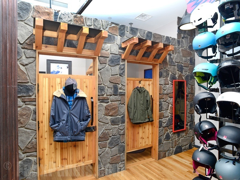 Below, Carlton Fieldstone panels in Smoke color provide an ambiance that reflects the mood of a ski chalet in the Rockies for this Burton Snowboards shop: