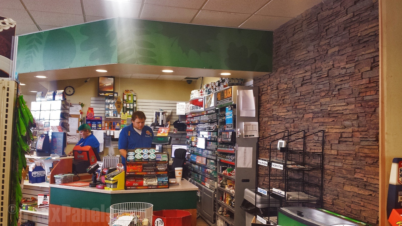 This convenience shop looks so much more appealing with its accent wall created with Norwich Colorado Stacked Stone panels in Earth color.