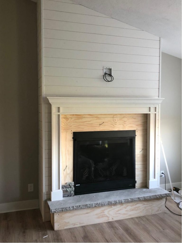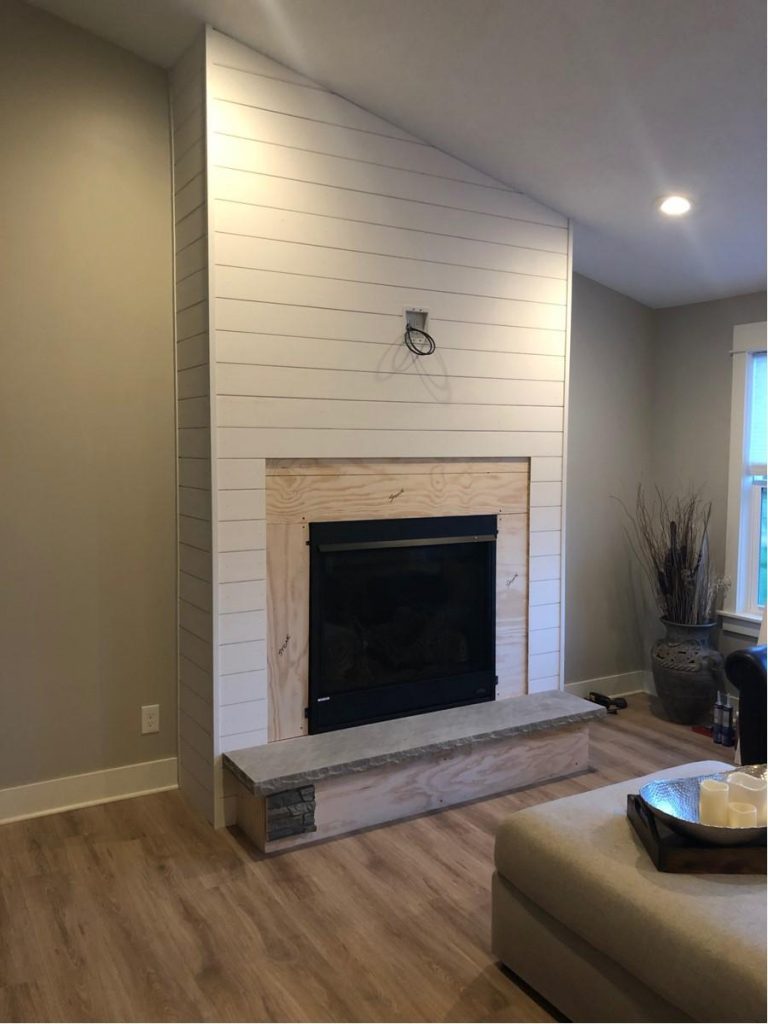 The project began by constructing a frame for the chimney, using standard framing methods. This was boxed in with a shiplap-style exterior, with a subtle indent cut out for the accent. A framed hearth with a real stone top was also built at the base of the fireplace.