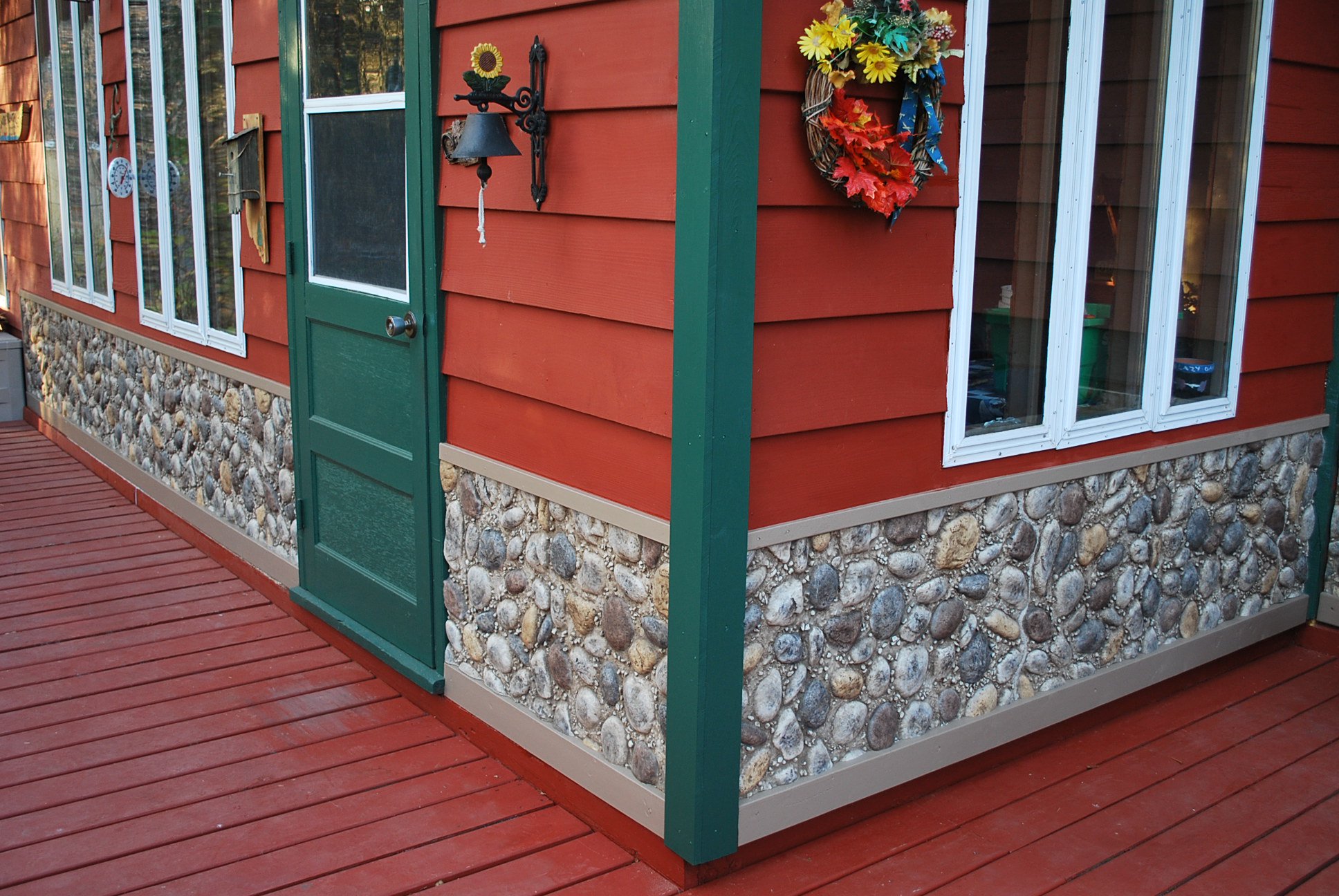 A great recent example of this comes out of Calgary, Canada, where Thea and Rick Connery revitalized the exterior of their cozy cabin with Multi-Color Wellington River Rock Panels. As you can see in the “before” photo above, the bottom section of the home’s clapboard siding was beginning to rot, evidenced by the ripples and buckling. After a quick and easy installation of panels with gray trim, the home's exterior is brought to its full potential - looking amazing against the rich red color of the wood.