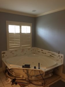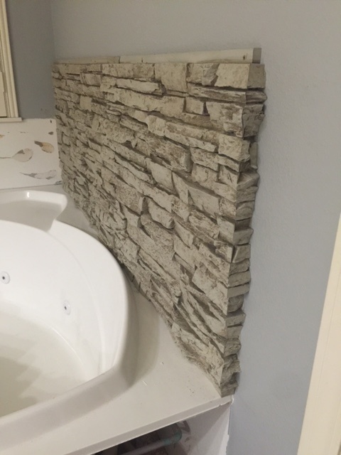 Homeowners from Ardmore, OK, sent in photos of their new corner tub wall surround -- made stunning with faux stone.