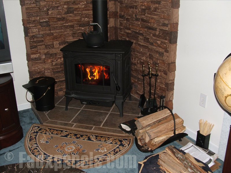 A corner wood burning stove accented with faux stacked stone panels in Sierra Brown. A corner wood burning stove backed by Stacked Stone panels in Sierra Brown