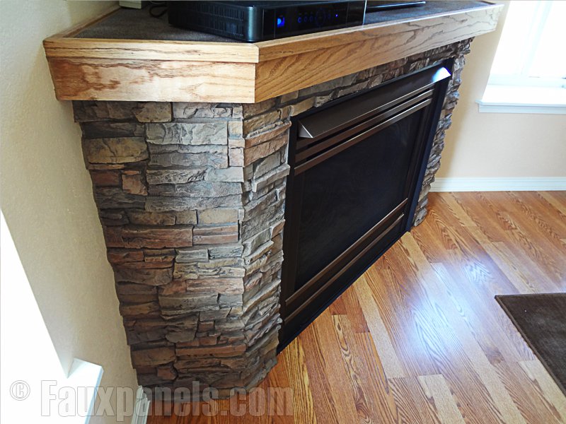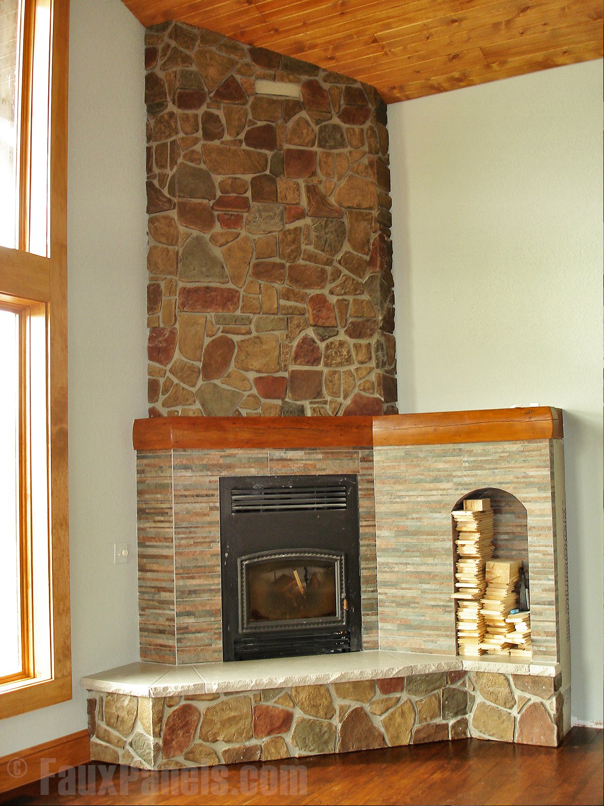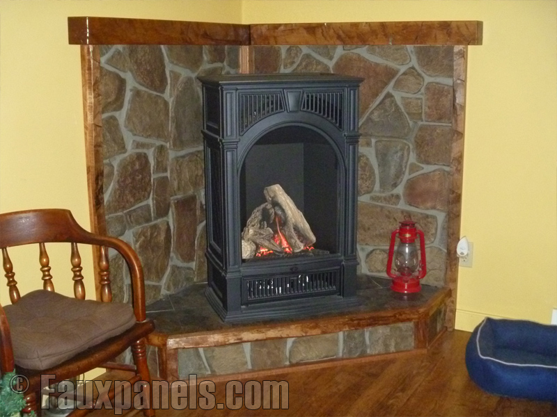 Fake Fieldstone panels are a perfect way to enhance the look of corner fireplace designs. Fake Fieldstone panels are a perfect way to enhance the look of corner fireplace designs.