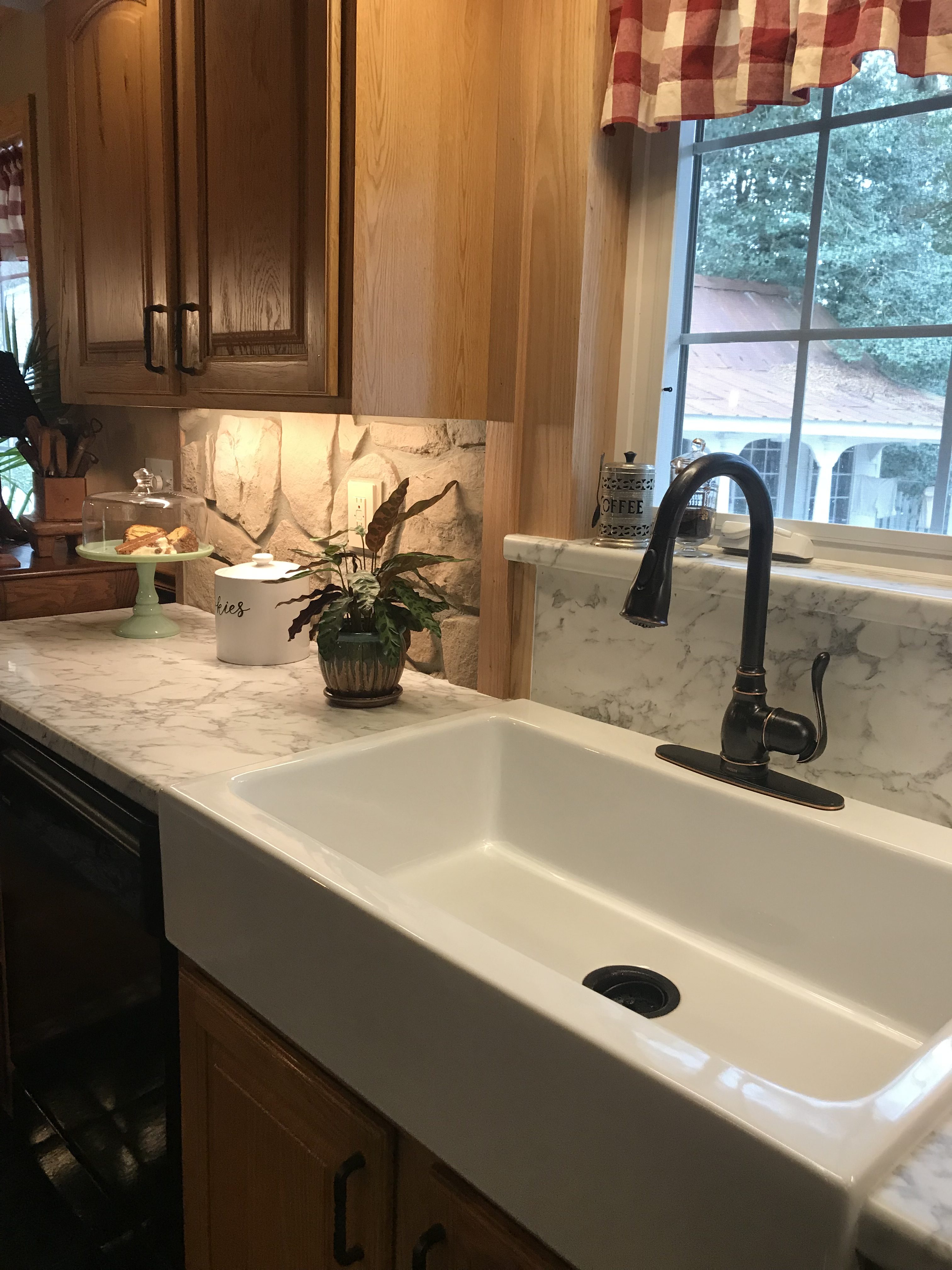 In this remodeling project, the homeowners wanted to add a French farmhouse-style element to their country kitchen; which worked well with their wood cabinets and beautiful porcelain double-wide sink.