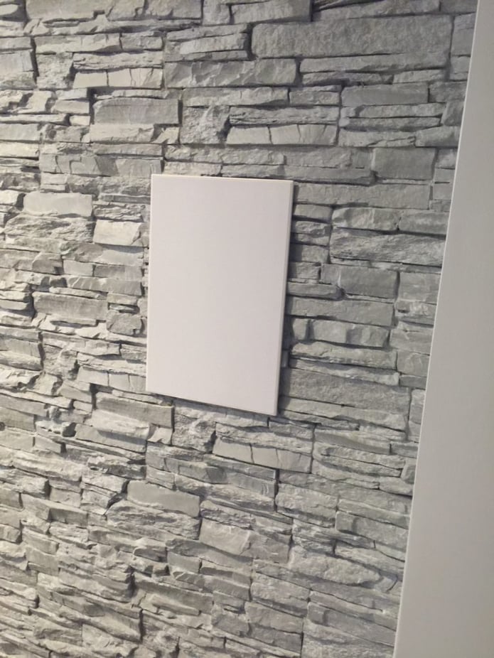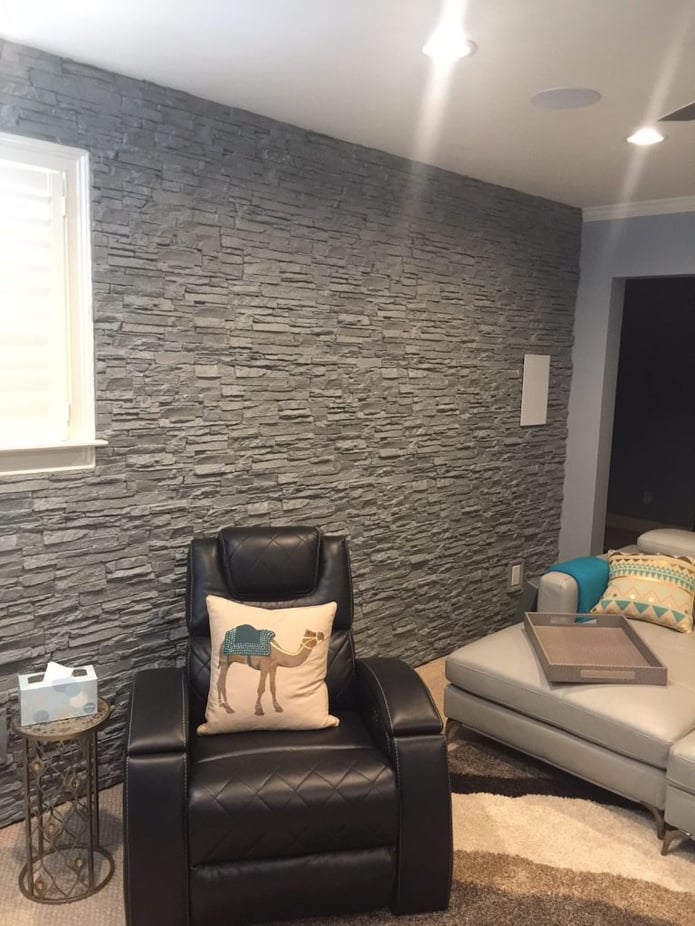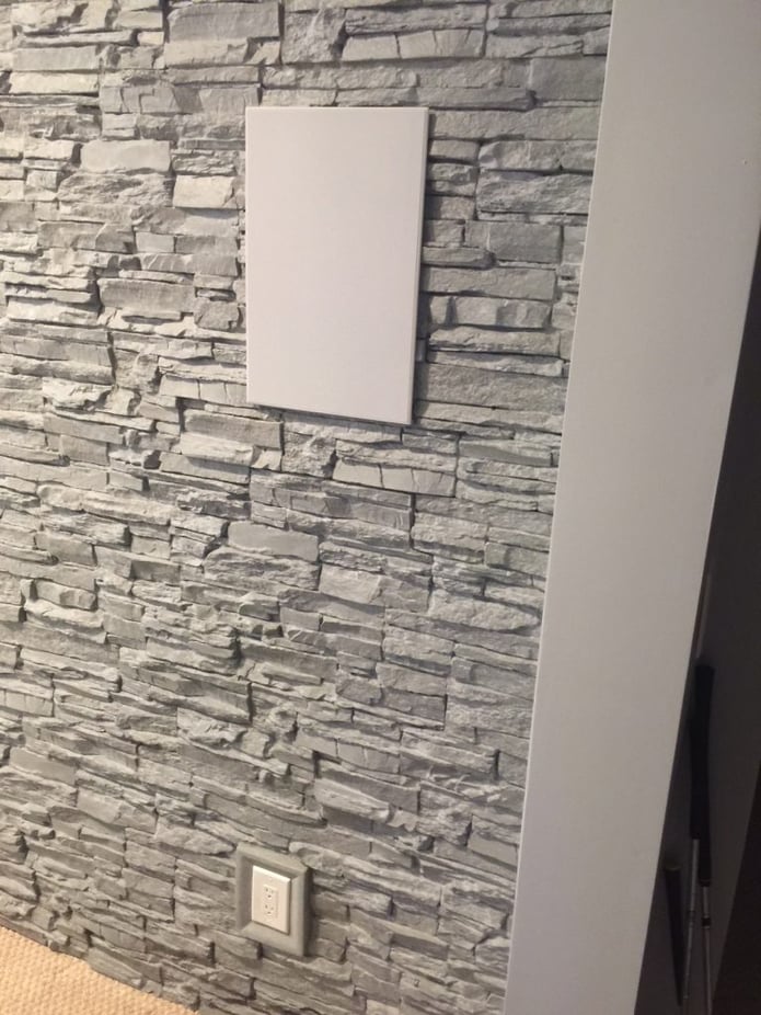 Lon's project was not done there, though. One of the additional challenges was the fact that installing our faux stone panels would cover up the electrical outlets on the wall. Because our panels are easy to trim, it was simple enough to cut a square out to give access to the panel - but it looked ugly and spoiled the realism of the faux stone wall. That's where our accessories come in - and Lon was able to buy matching grey outlet covers that fit flush with the hole he'd cut, and helped maintain the texture of the stone panels.