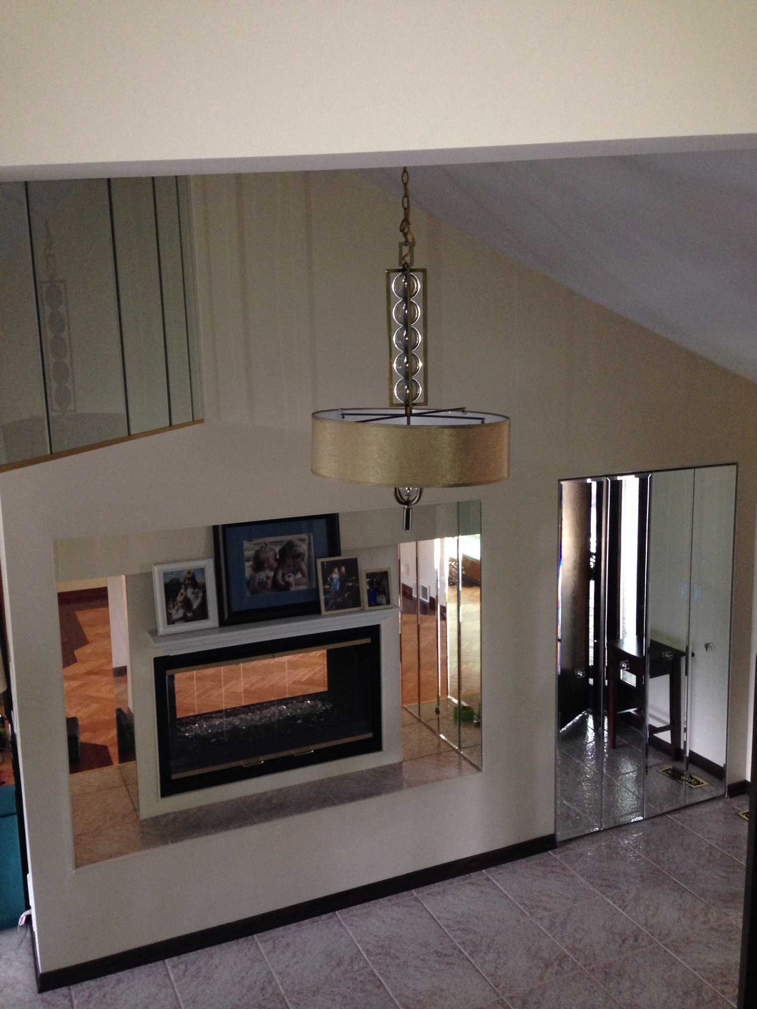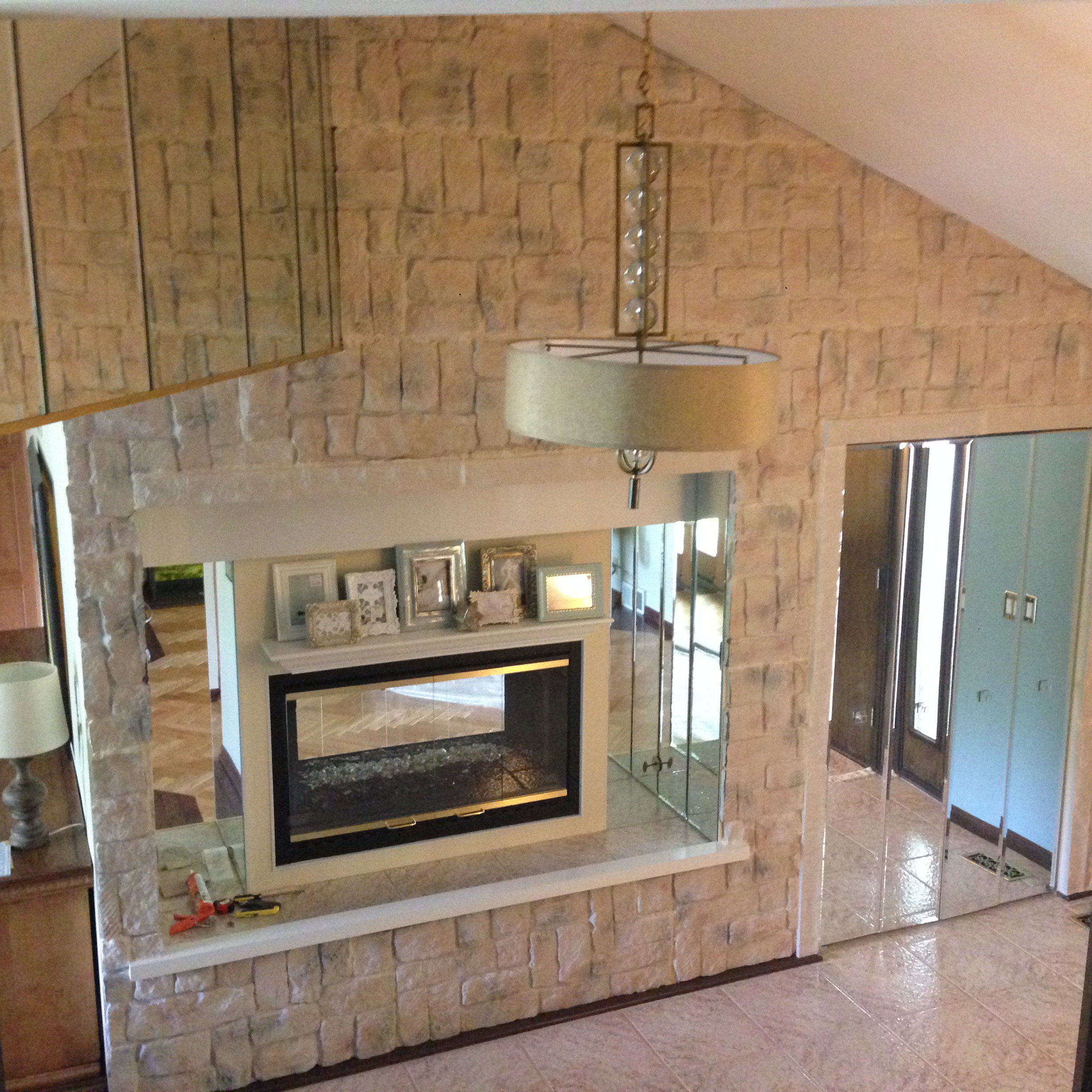 Before photo: fireplace surrounding wall BEFORE: The wall surface was flat, drab and uninteresting.
