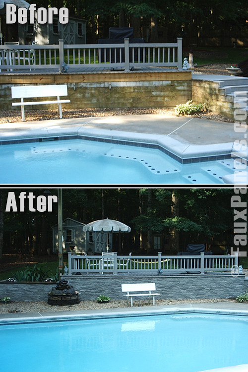 “We are submitting these before and after pictures of a retaining wall in our pool area. We installed gray Nailon panels on the wall and could not be happier with the results. Before application, the retaining wall was unsightly and the paint would repeatedly peel. Now the wall is a centerpiece of beauty and sets off the area complimenting the deck.