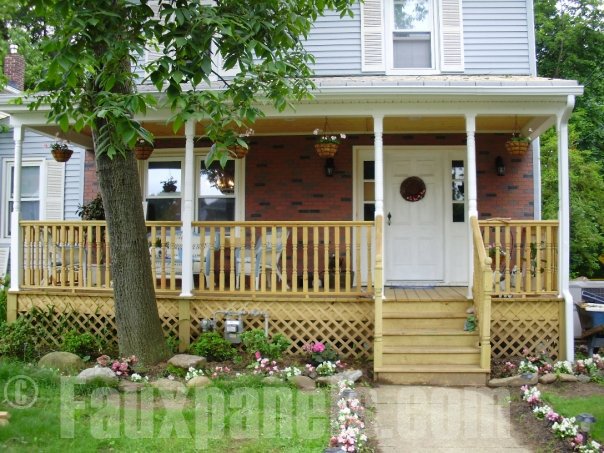 In the next photo, you’ll see how brick panels create an elegant backdrop for the front porch of the house. While adding a comfortable feel to the porch, the panels also nicely improve the home’s curb appeal.