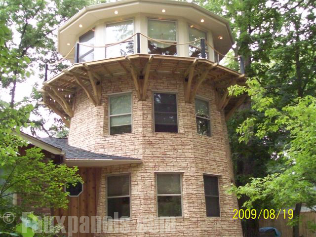 The exterior of this uniquely shaped home is given the appearance of authentic rock with Stonewall panels in Light Tan, which are extremely easy to install and miter.