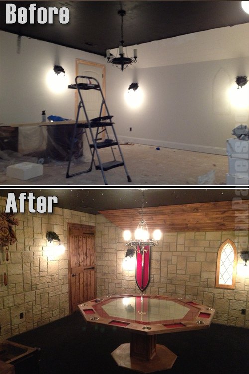 The carpet was replaced with dark flooring, and then came the faux panels. From floor to ceiling, Brent installed our Carlton Castle Rock stone veneer panels in a seamless pattern that would look home inside any medieval fortress.