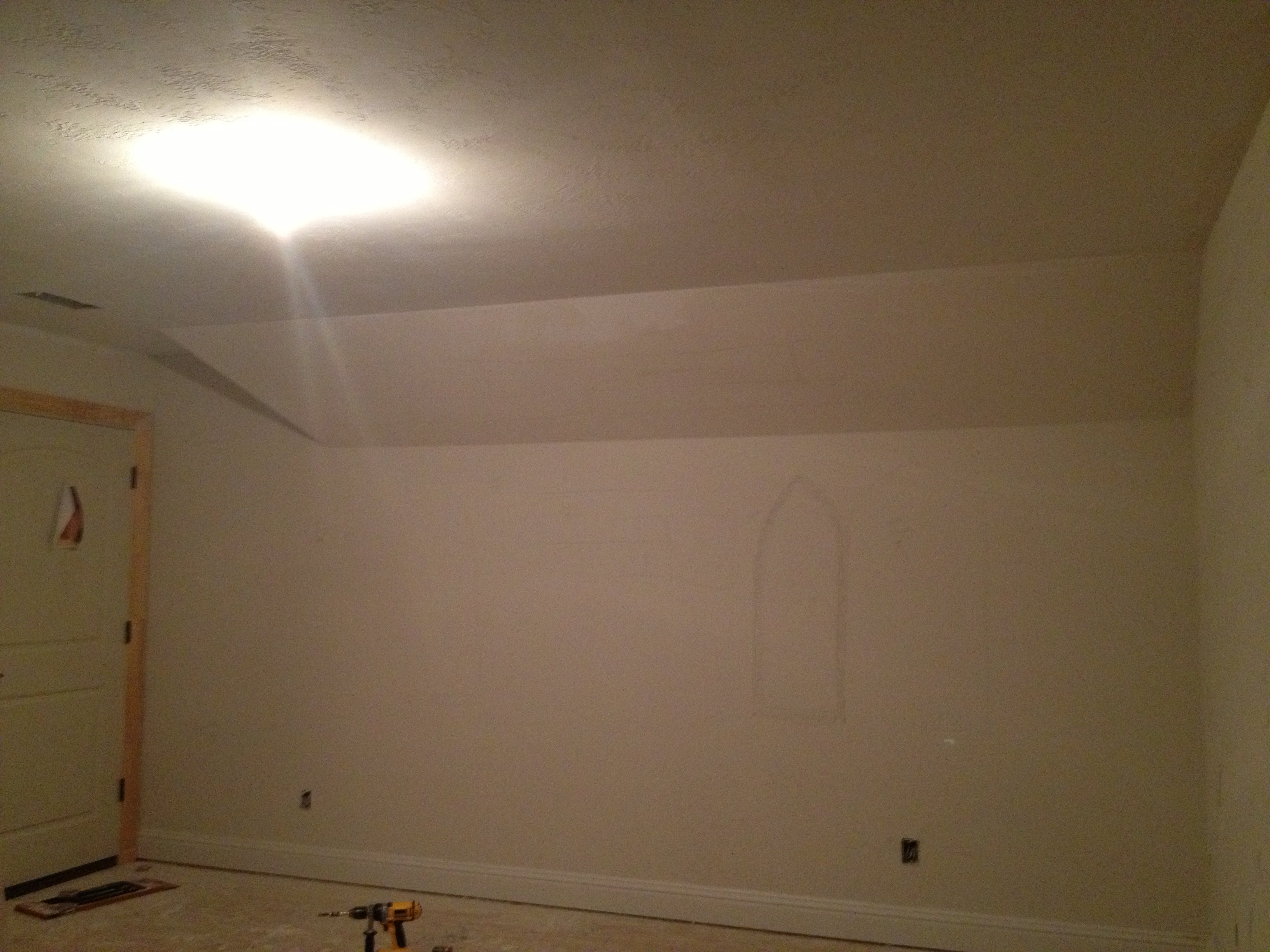 You can see in the BEFORE picture, how he'd stenciled in a classic castle-style window shape.