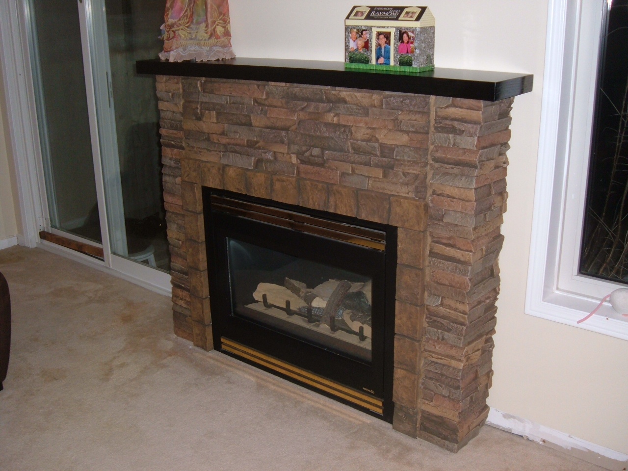 First, I built a new wood frame for the fireplace and finished it with 1/2” pieces of drywall. Then, the window/door trim was cut in equal length pieces to resemble brick masonry around the fireplace, and was put in place using an adhesive.