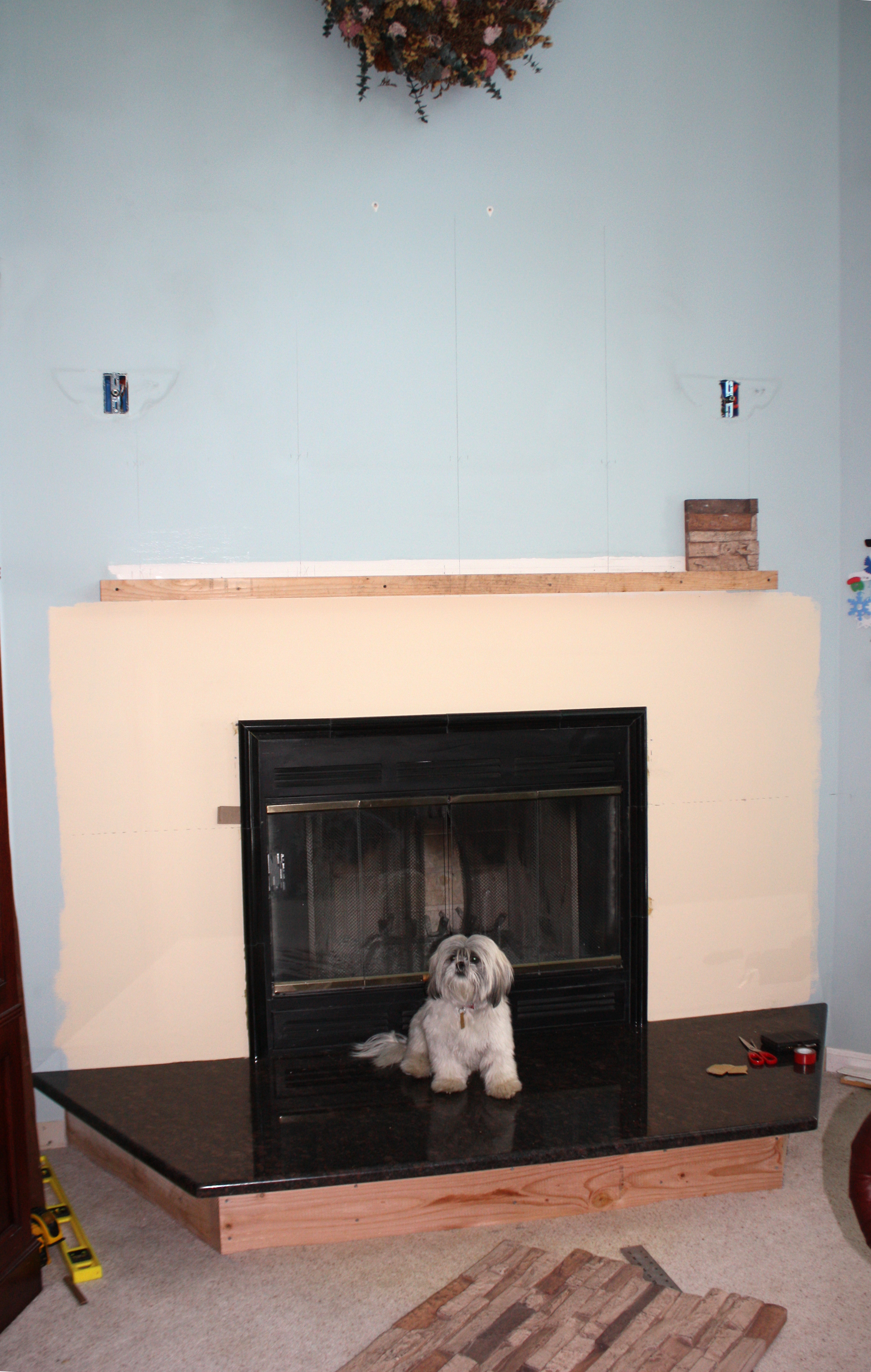 “Our fireplace is on an angled wall all by itself,” wrote Mike Grace, when he sent in these before and after pictures, “so we thought it lent itself naturally to a unique treatment.”