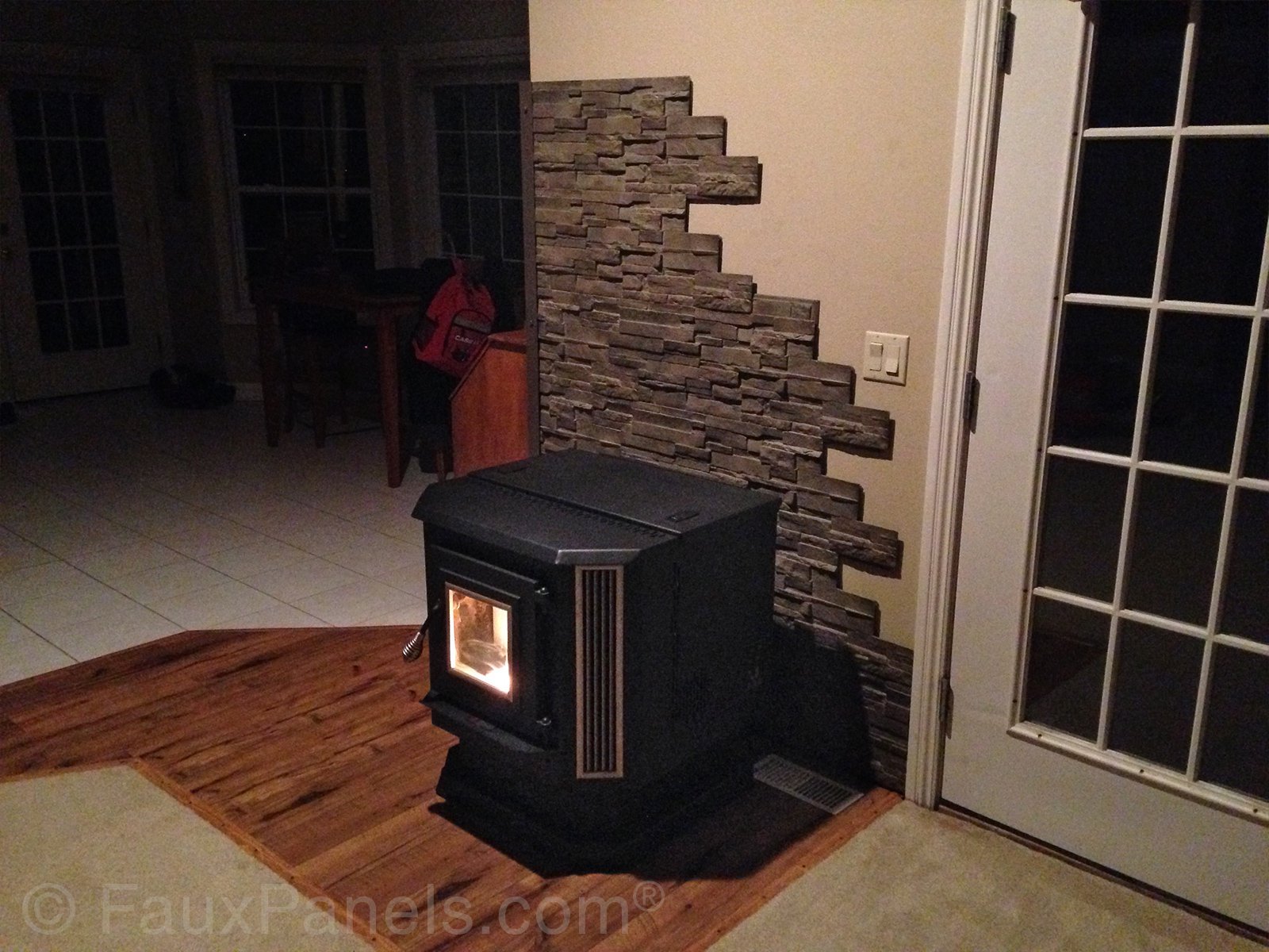 Fire-rated panels behind a wood stove cut to look like a real exposed stone wall.