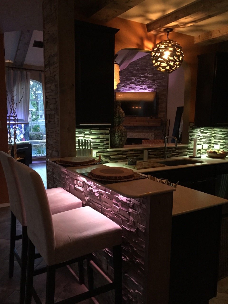 Two elements were incorporated. Overhead, the owners installed Custom Hand Hewn Real Wood beams. The island and other areas in the kitchen were then finished with our Norwich Stacked Stone panels; for a beautiful finish that vividly resembled real hand-laid, stacked-stone walls.