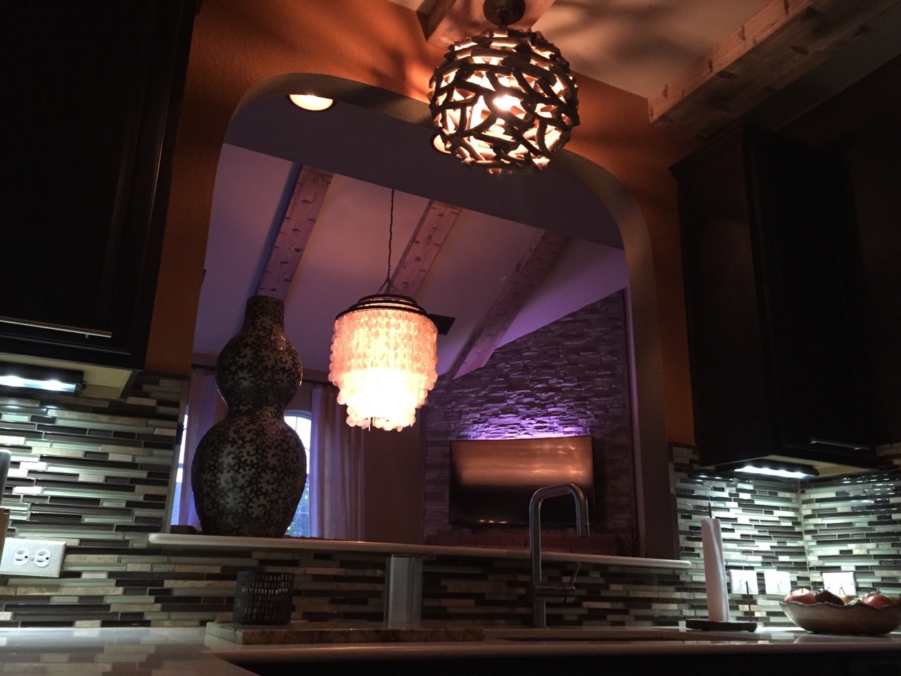 But the owners decided to take this installation a step further, and in addition to our panels, they also installed custom, color-changing LED lights underneath the counters. These could be lit up at night in a variety of different hues, allowing the owners to instantly transform the atmosphere of the kitchen - from a cool and classy blue, to a warm and intimate rose or purple.