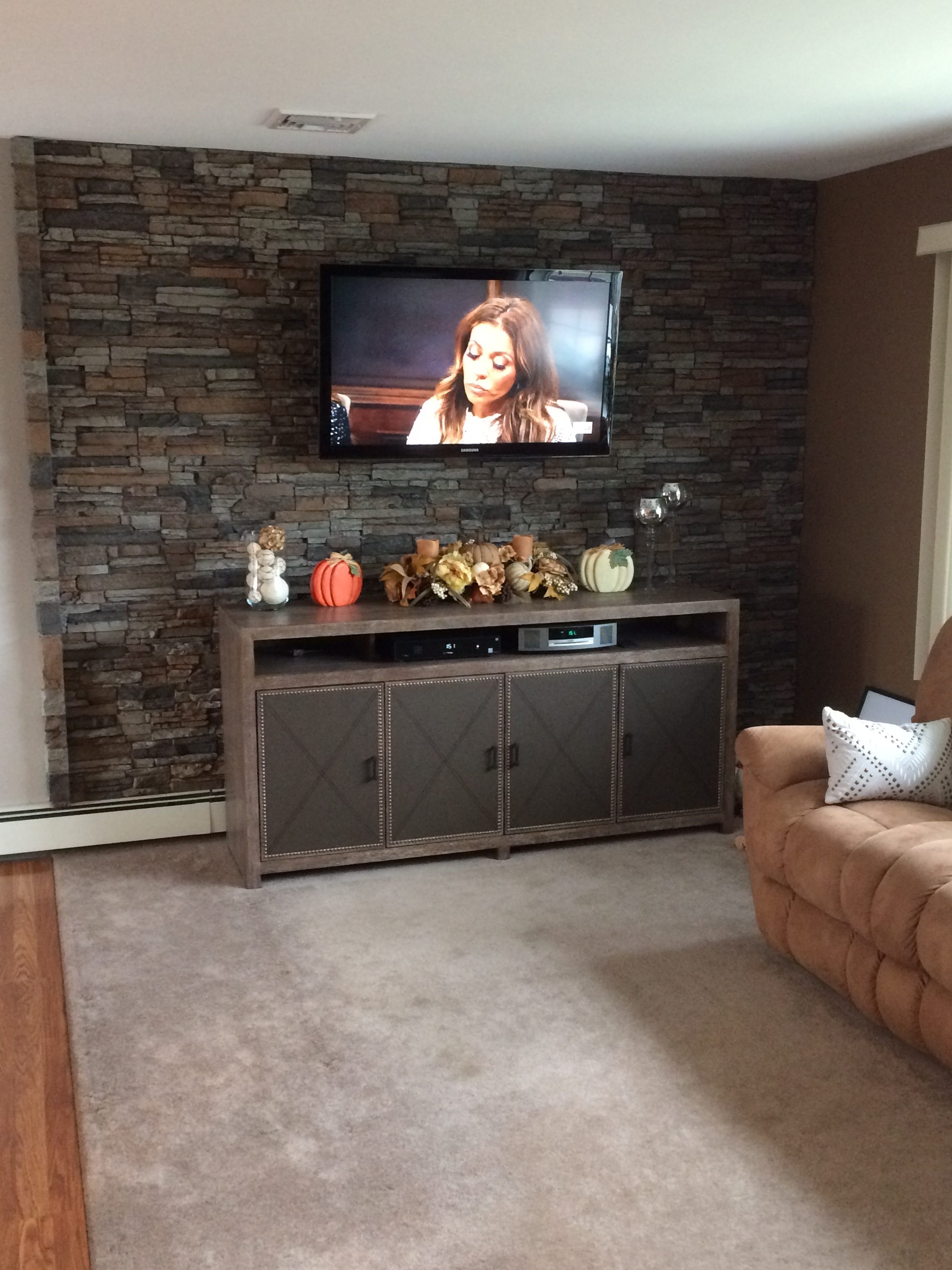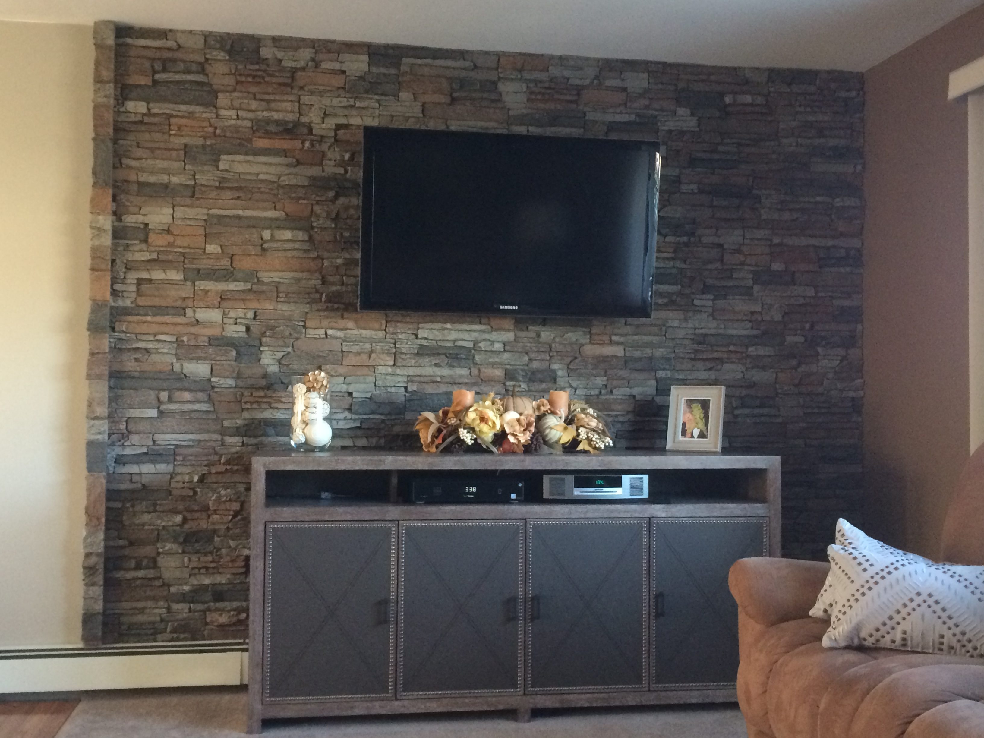 Today we're excited to share this project. Debbie wanted to add some classic style to her living room, but didn't want to go over-the-top. Her solution was to create a small accent wall behind the TV using the stacked stone panels.