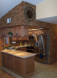 Julio adds a little Aztec flair to his kitchen with the clever use of our Oxford Simulated Stone Wall Panels.