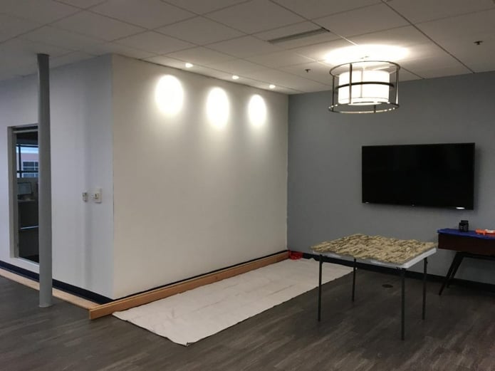 The second was even more subtle - take a look at the ceiling and you'll see a subtle line of recessed spotlights. These light up the accent wall, but are angled to emphasize the vivid, three-dimensional texture of the faux stone. It almost turns the wall into a piece of artwork for the office.