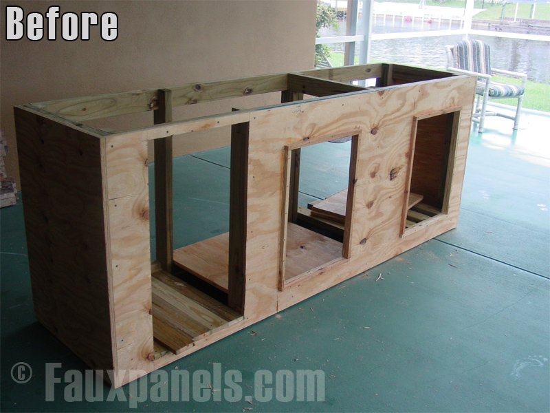 Mr. Ellis first built the frame with pressure treated lumber and used exterior grade, 3/4 inch plywood for the sides and underneath the counter top. Stainless steel T-Nuts were then placed on the bottom; 4 in front and 4 in back to level the structure and keep the wood off the concrete pad.