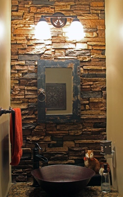 In the powder room, the same concept of an accent wall was used, just smaller and doubling as a bathroomn sink backsplash.