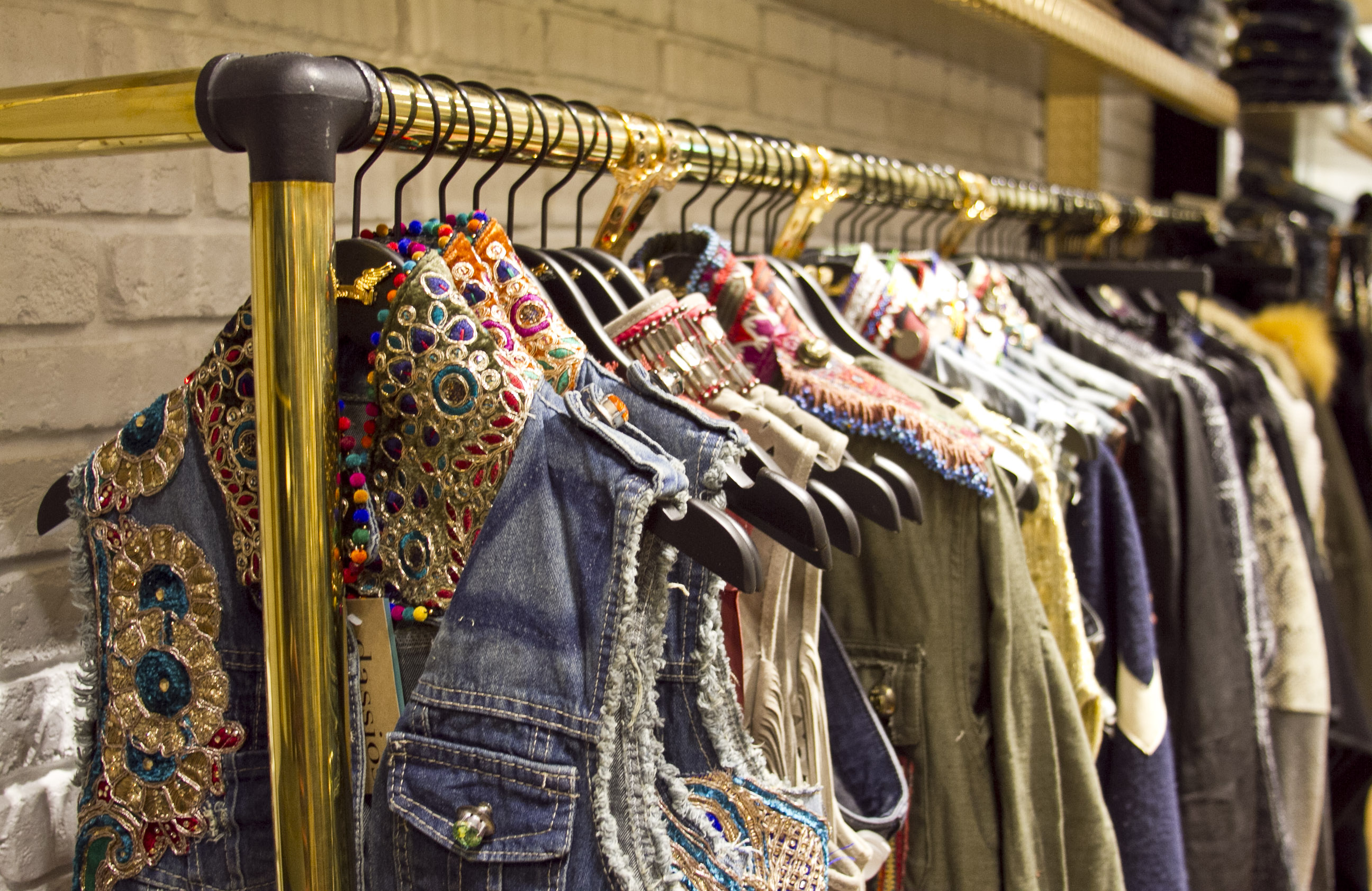 The crisp look of the white brick behind the clothing racks is a subtle, yet distinctive design element that adds some grounded flair to the bright walls and glitzy gold.