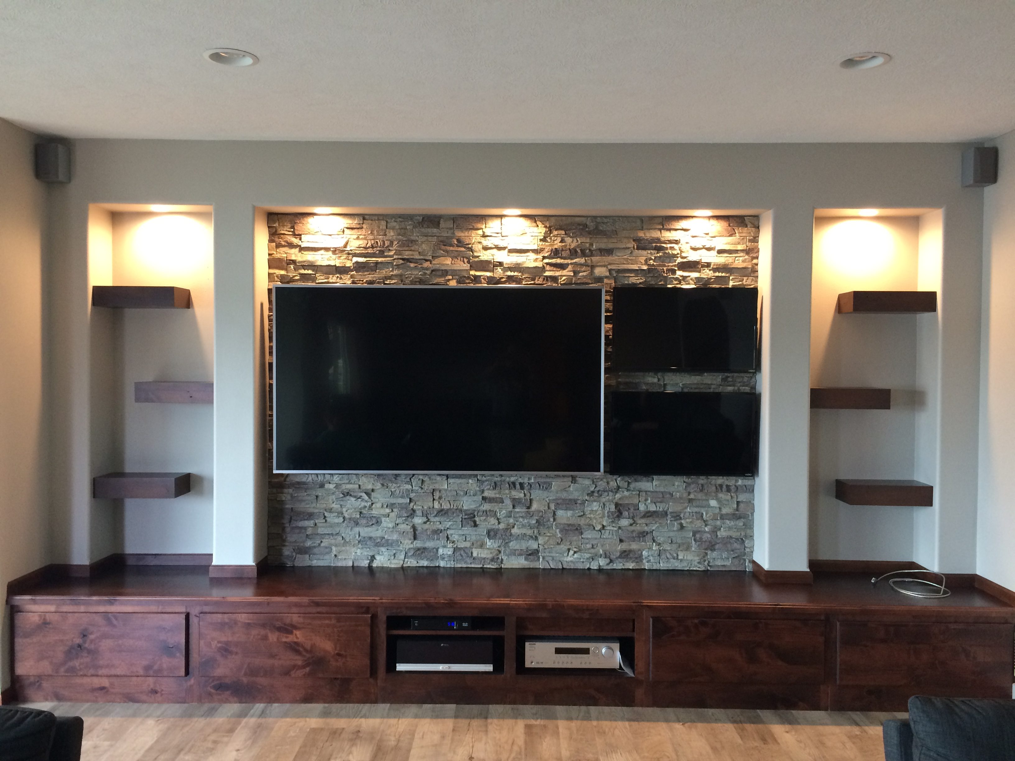 Once the flatscreens were on the brackets, they completely covered any holes in the faux finish - and the entire wall looks perfect. It's a solution that's elegant in its simplicity; and the end result looks amazing.