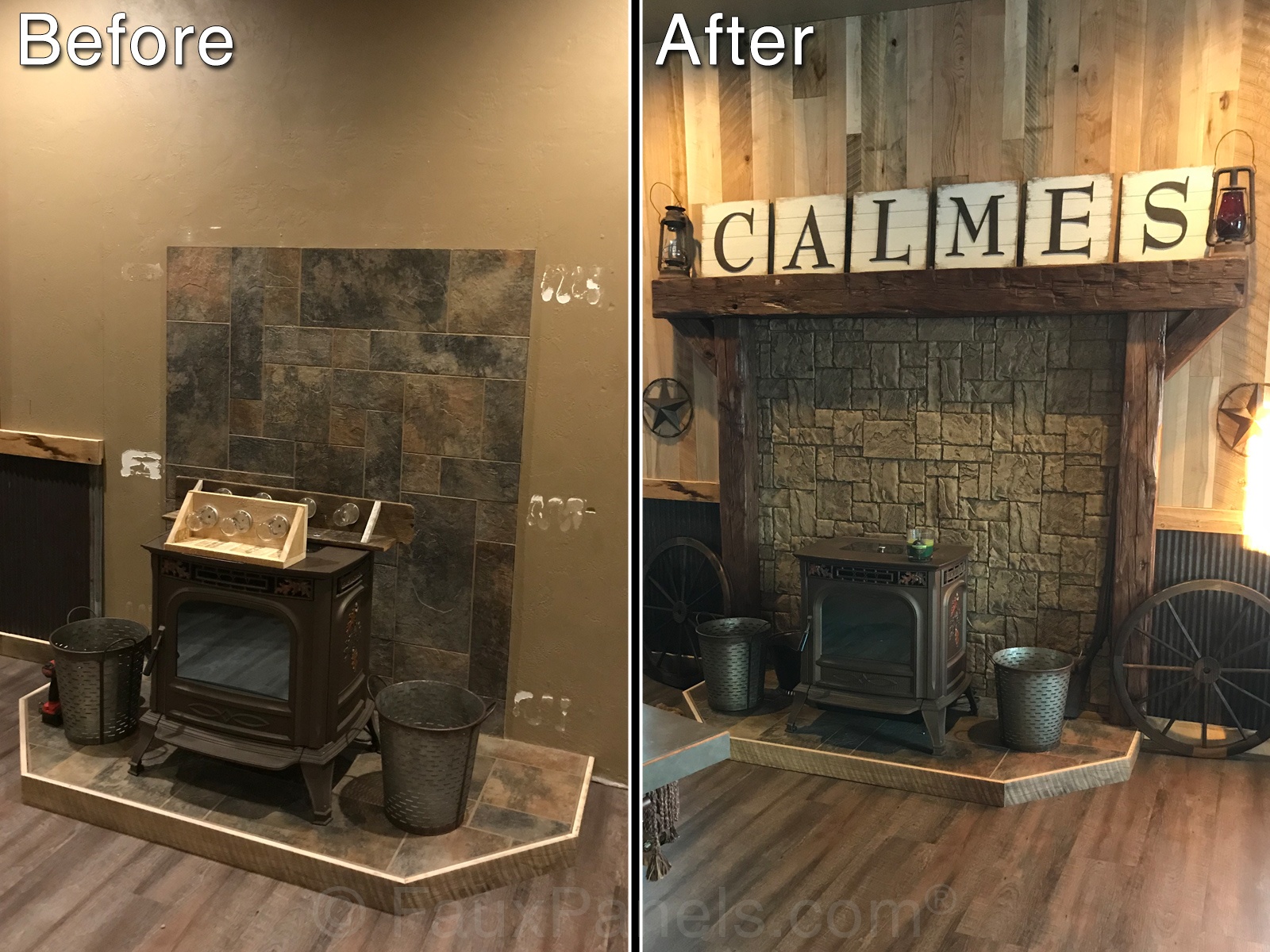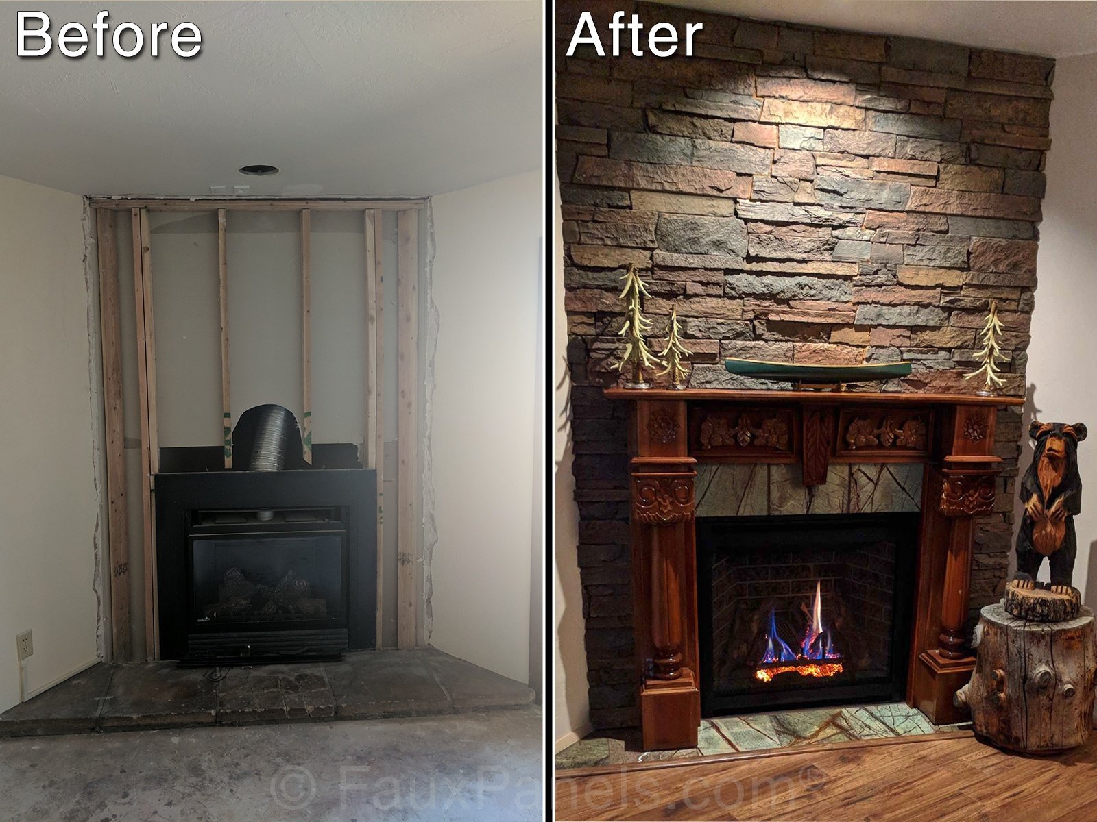 Before and after fireplace, Norwich Dakota Stonewall panels, in Earth color. Norwich Dakota Stonewall panels, in Earth color.