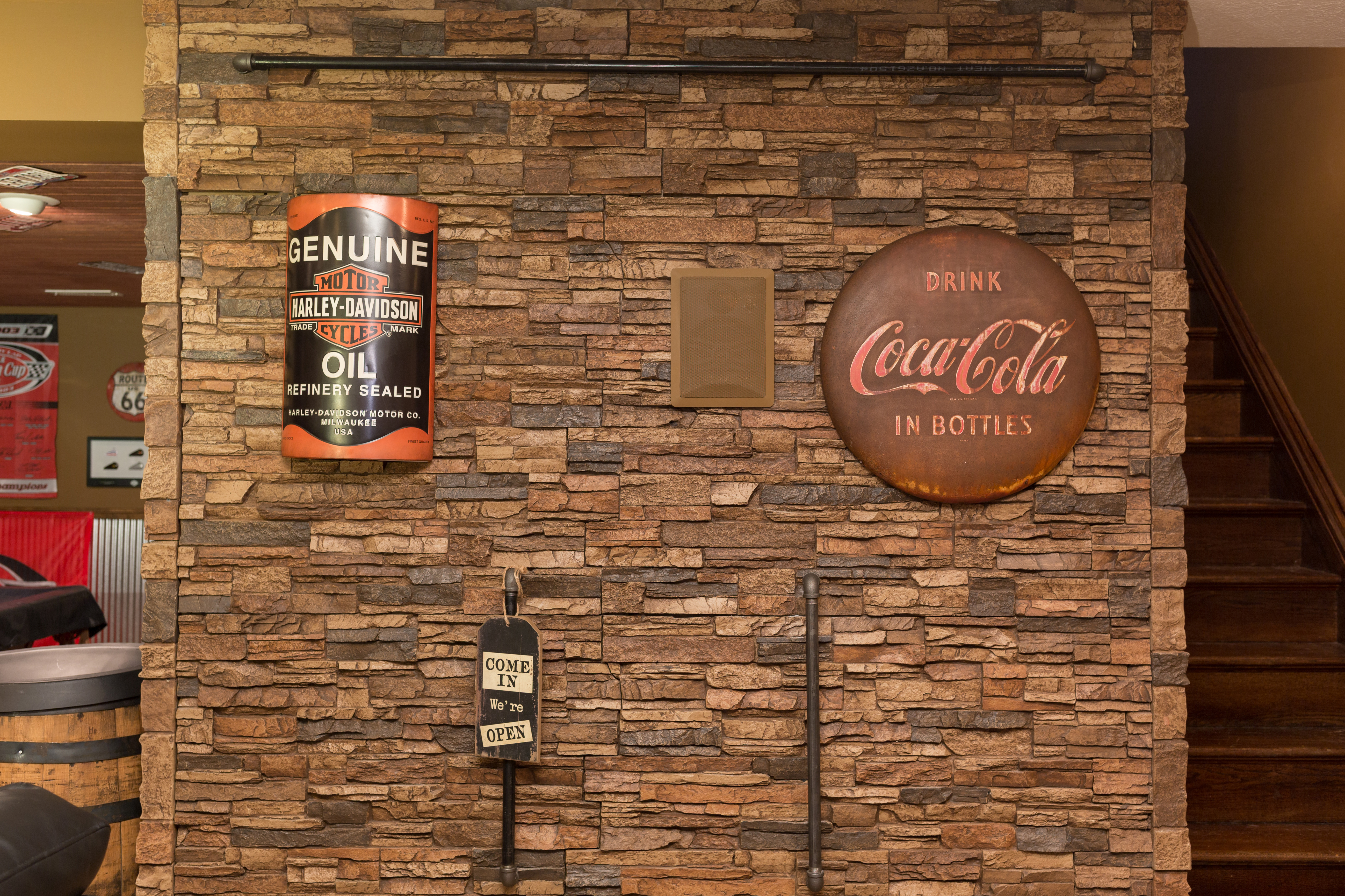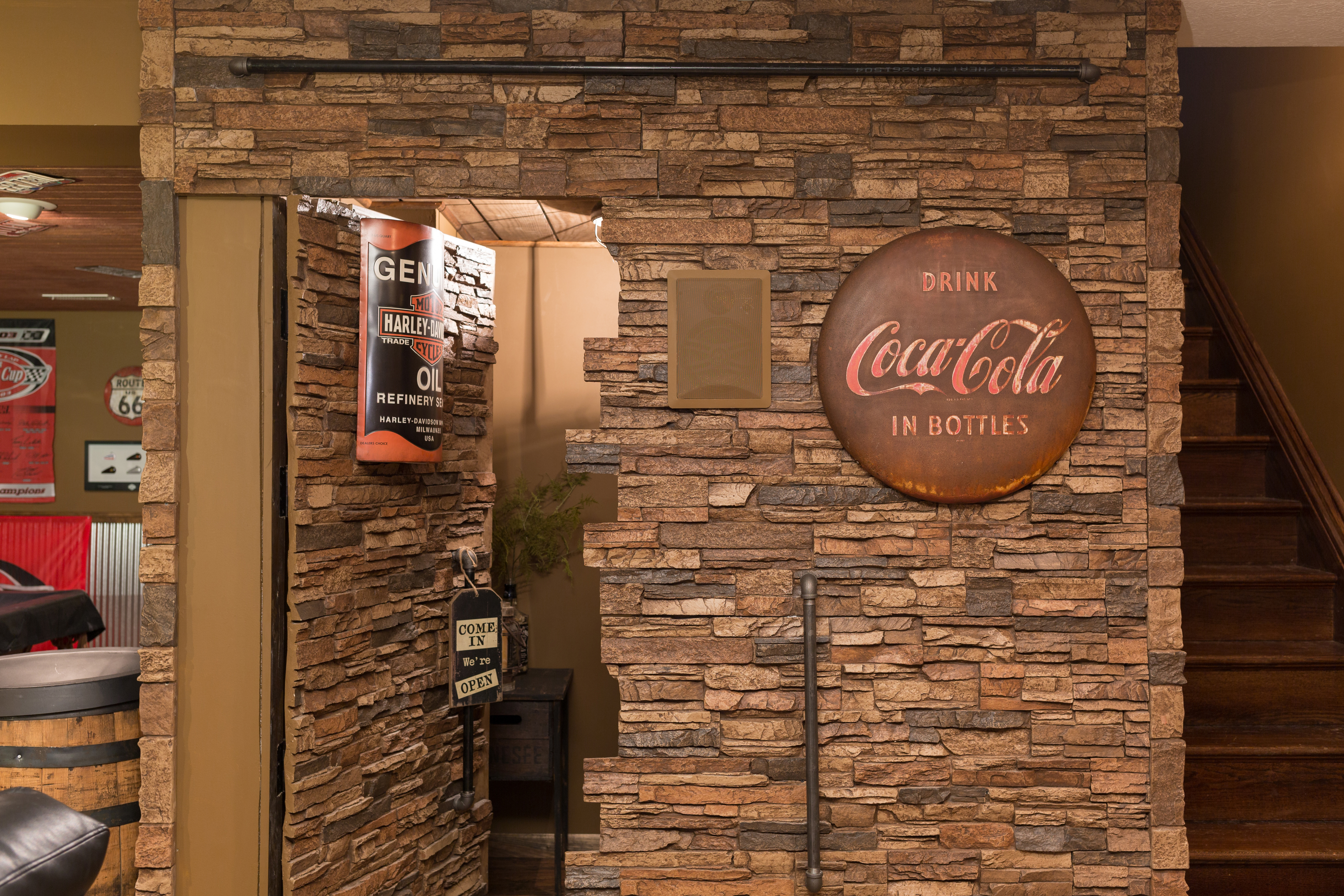 The project would have been spectacular enough even without the secret we're about to reveal. Created using Norwich Colorado Stacked Stone panel, corners and ledgers in the Sierra Brown color, Erin built this incredible wetbar in her home's basement, complete with vintage and period trinkets that make it look as stylish as a full-service restaurant. The panels look just like authentic stone, and really fill the room with character.