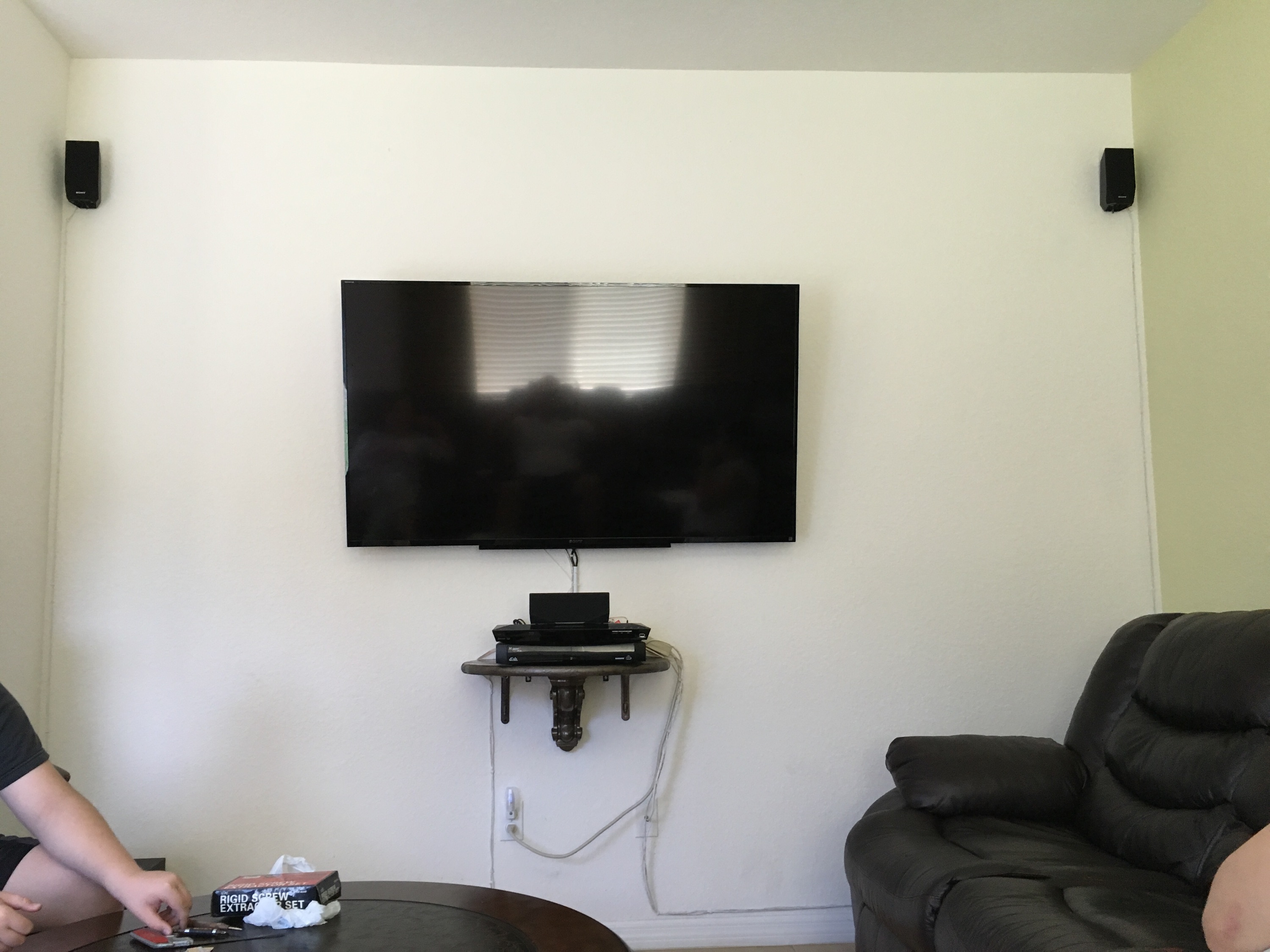 The installation was straightforward. Armando had to measure and account for where the hidden wires would run, and create a hole to allow the cables out. You can see it in the photo - practically invisible, compared to the snaking wires from the 'before' picture.