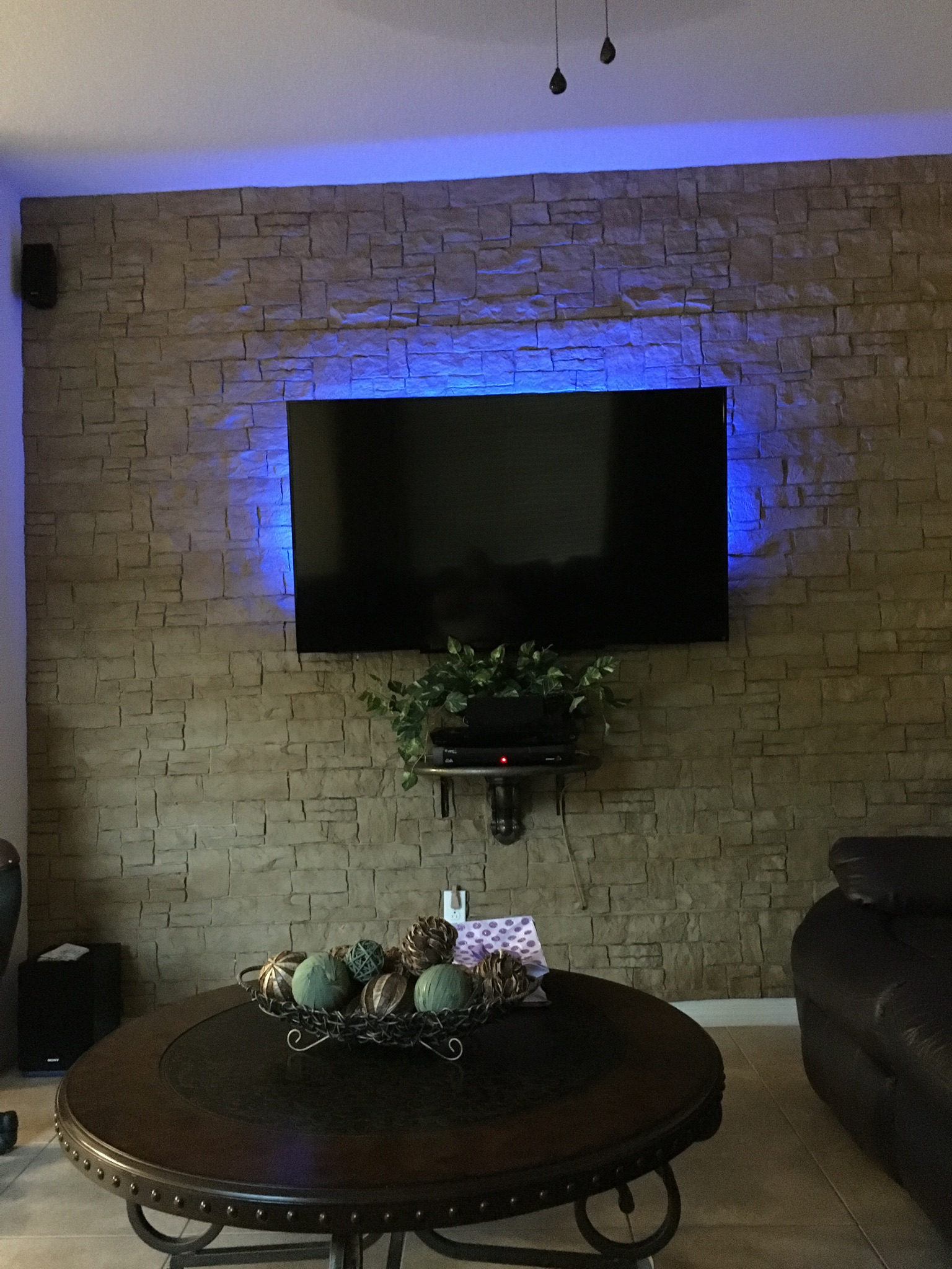 It was a simple concept, but executed beautifully - and the final detail was the backlit LED. That's where the real genius of Armando's design emerged. Rather than a bland, boring plain white wall like the one that had been there before, the texture on the Stonwall panels lit up beautifully under the color-LED. It made the TV appear truly cinematic; and really demonstrated the vividly realistic texture of our panels.